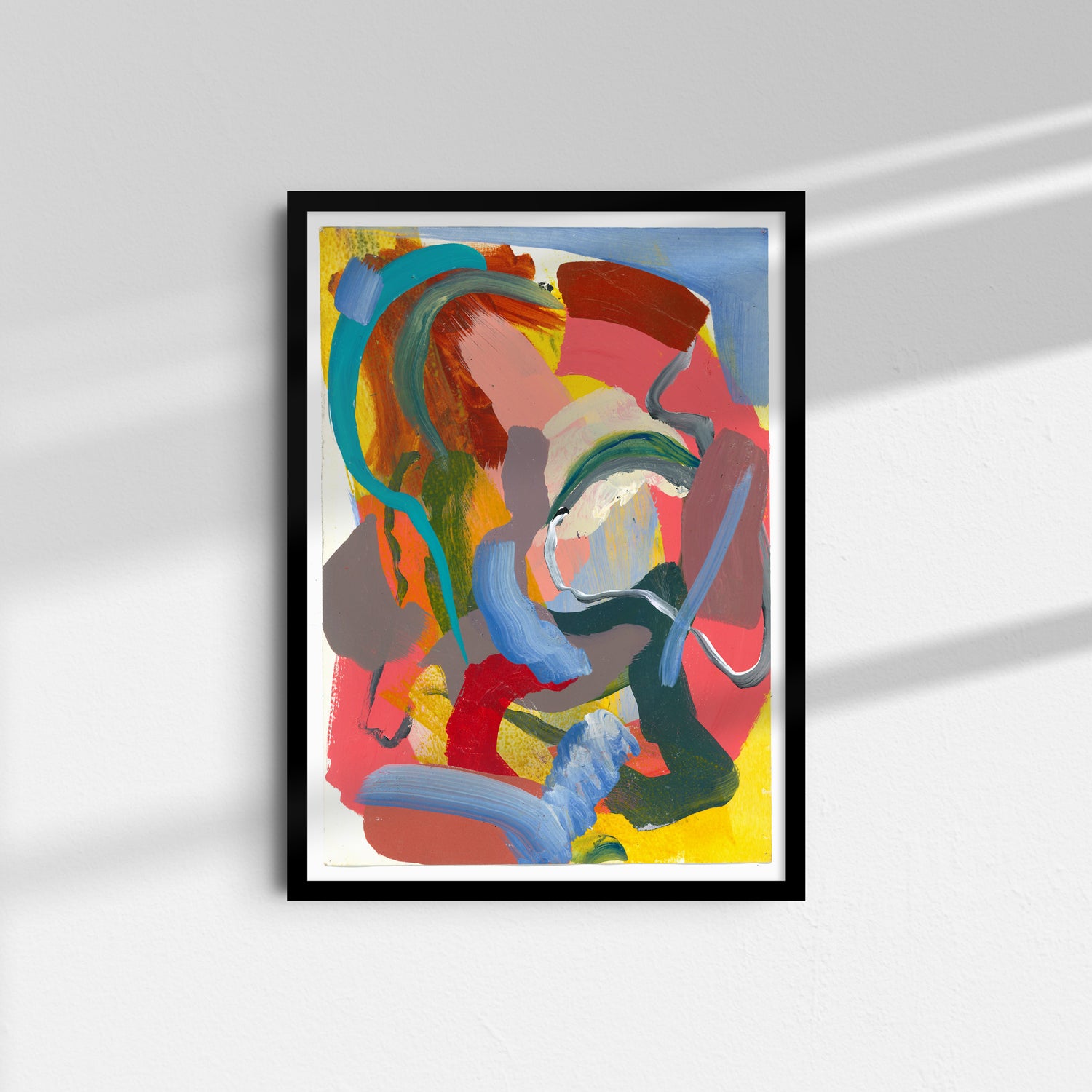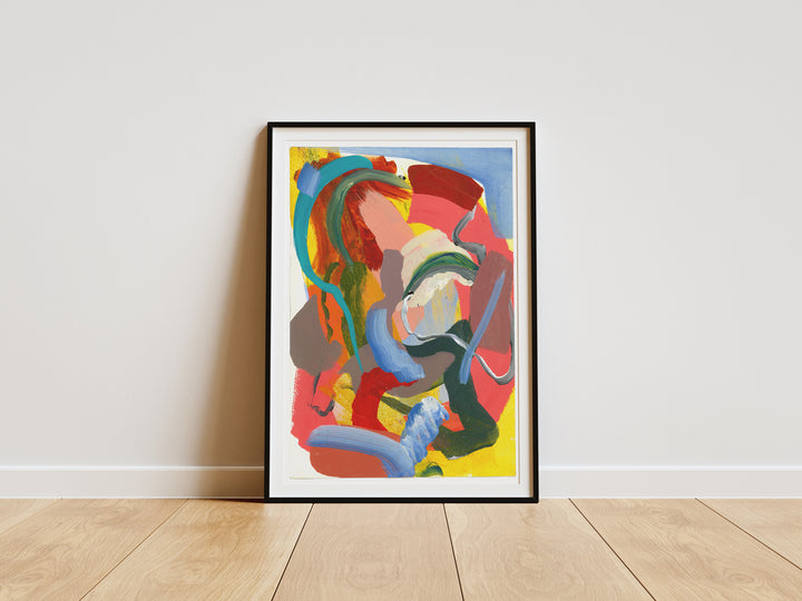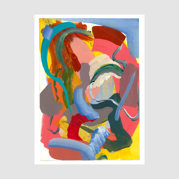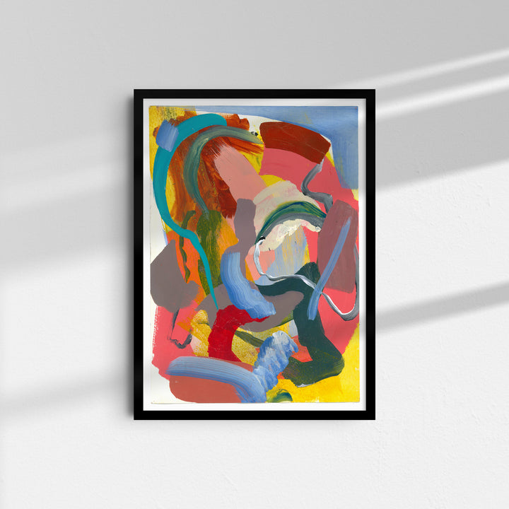 Swirling strokes of teal, red, yellow, and soft pastels create a lively, energetic composition. Layers of colour overlap and twist, giving this piece a sense of movement and playful spontaneity.