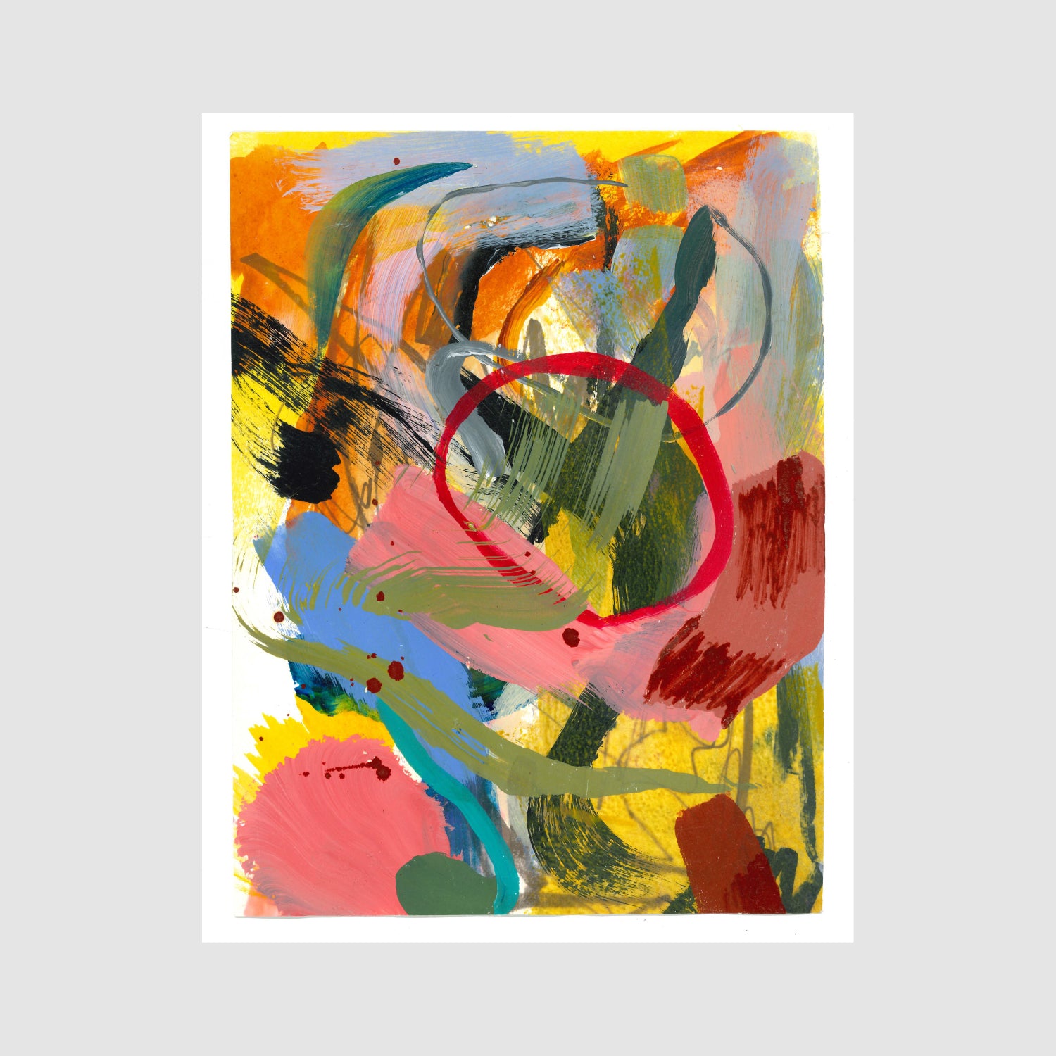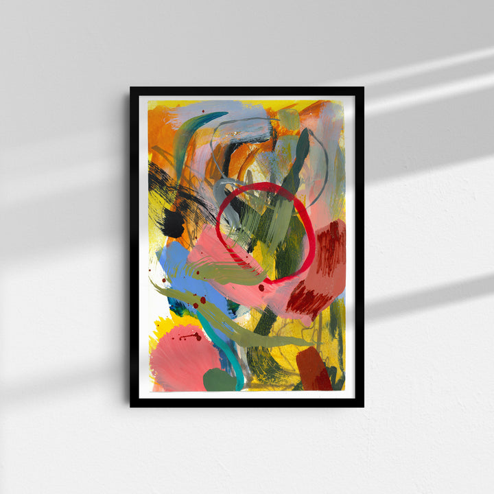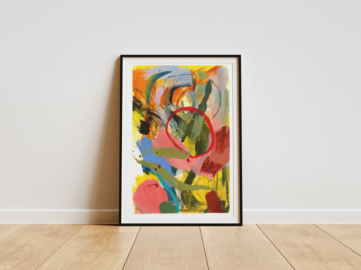 A lively mix of pink, green, yellow, and red moves across the canvas in bold, sweeping strokes. This piece is full of energy and colour, with expressive marks that feel spontaneous and joyful.