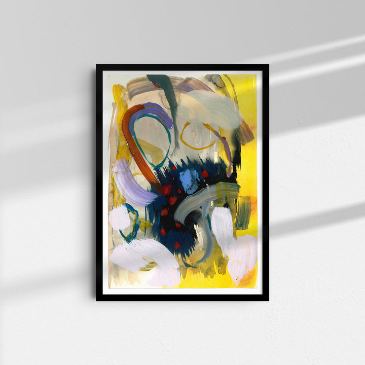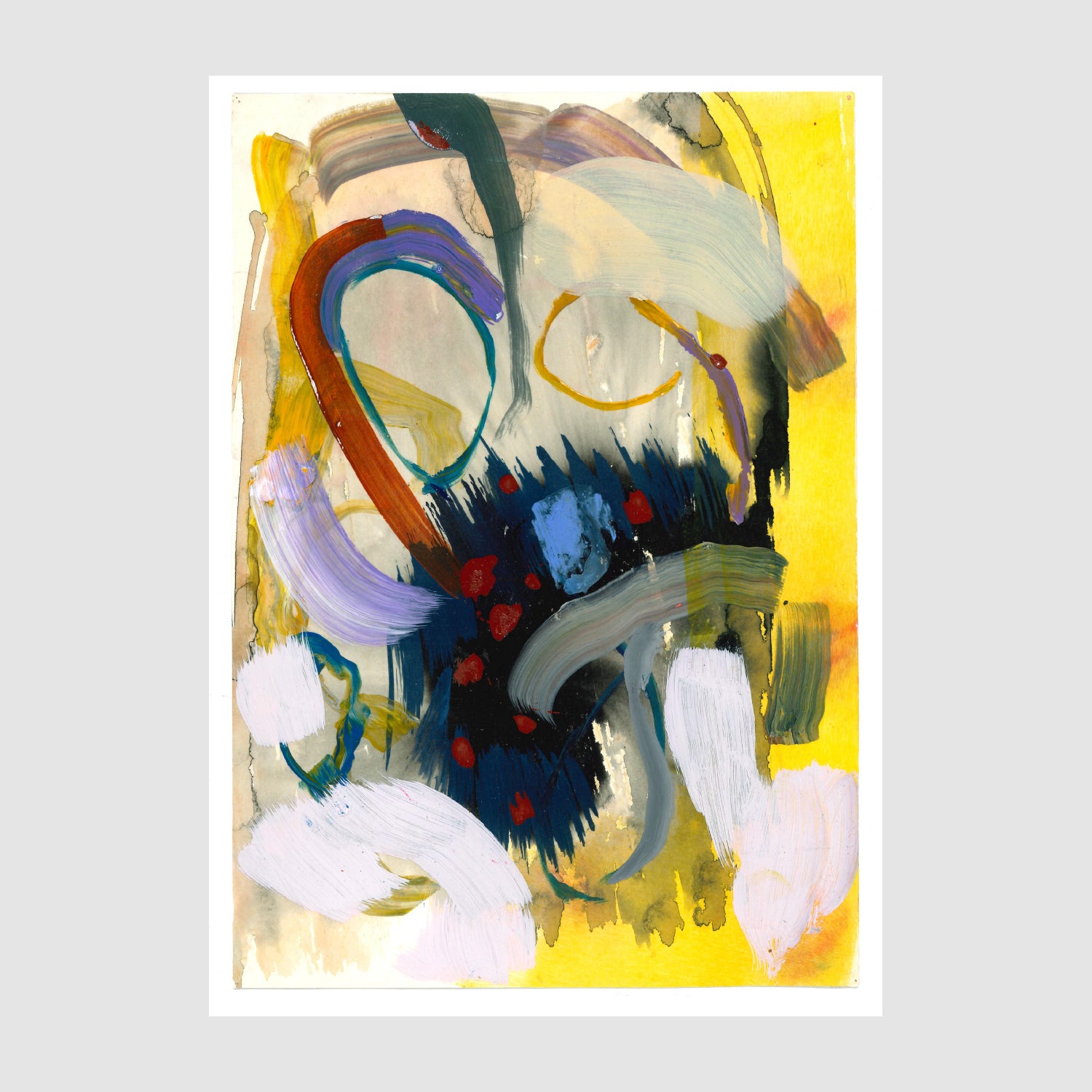 Deep blues and blacks meet bright yellow, soft lilac, and warm, earthy tones in a bold, expressive arrangement. The sweeping marks and layered textures give the piece an intense, energetic presence.