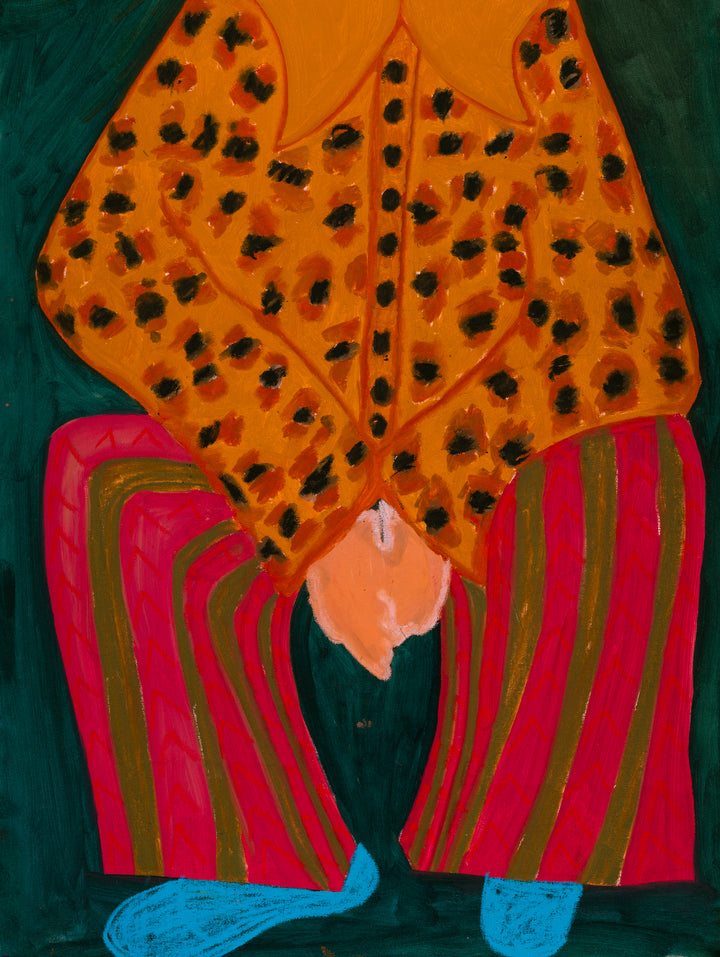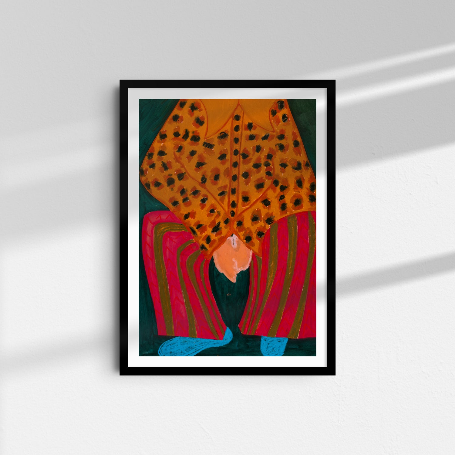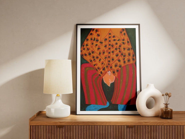 A playful mix of pattern and colour, featuring an orange cheetah-print top paired with bold red-and-olive striped pants. Bright blue socks add a fun pop, making this piece feel confident, vibrant, and full of personality.