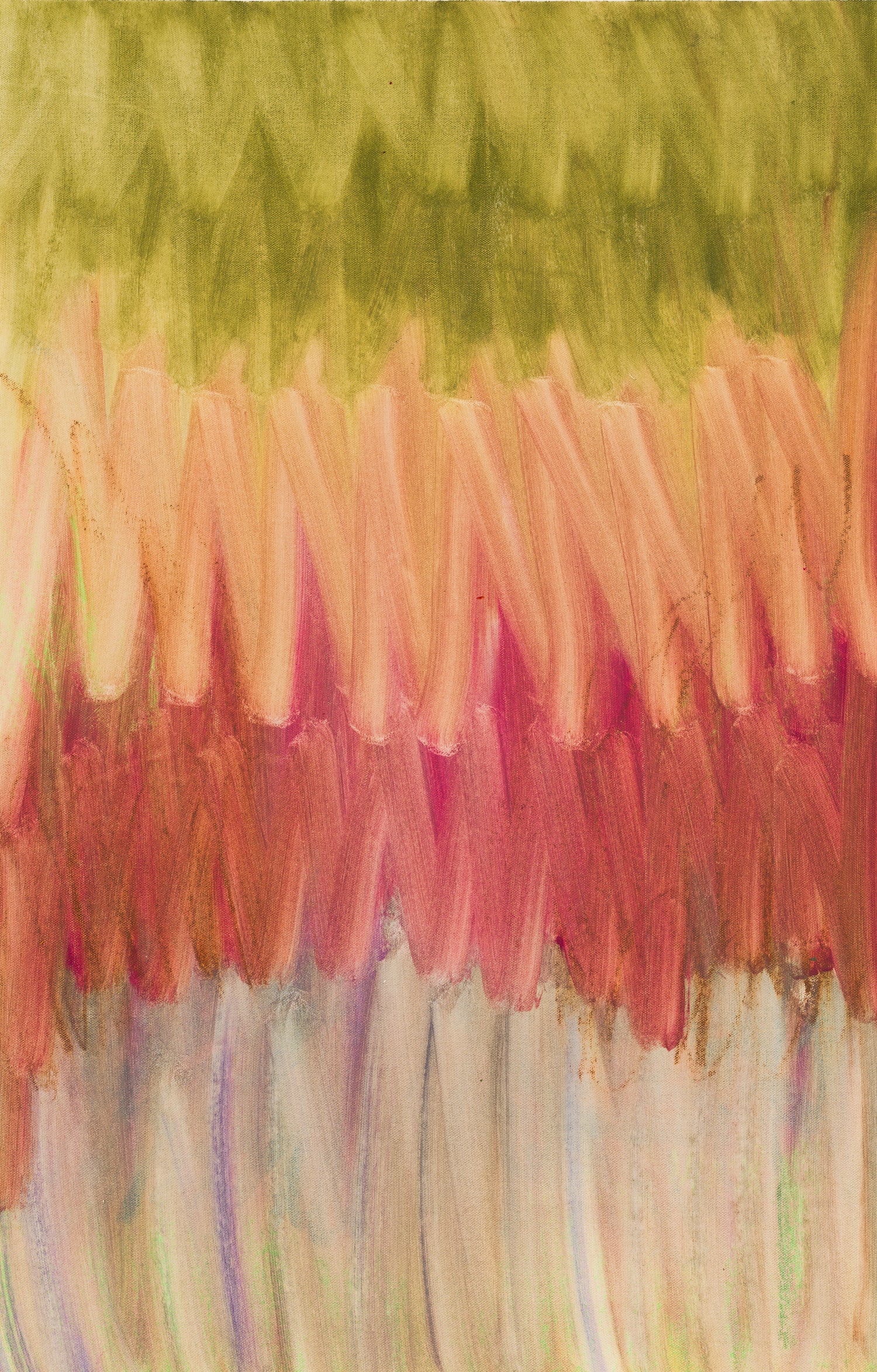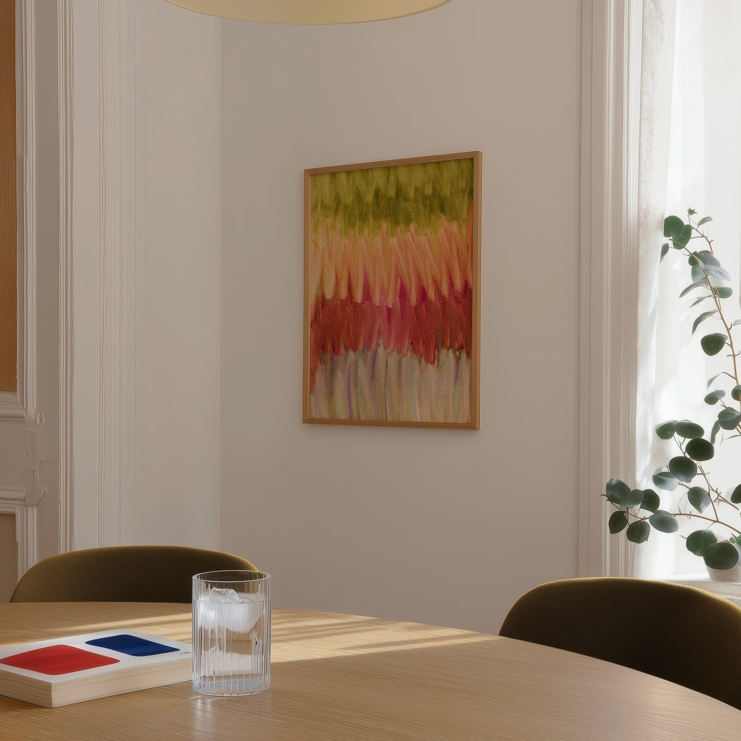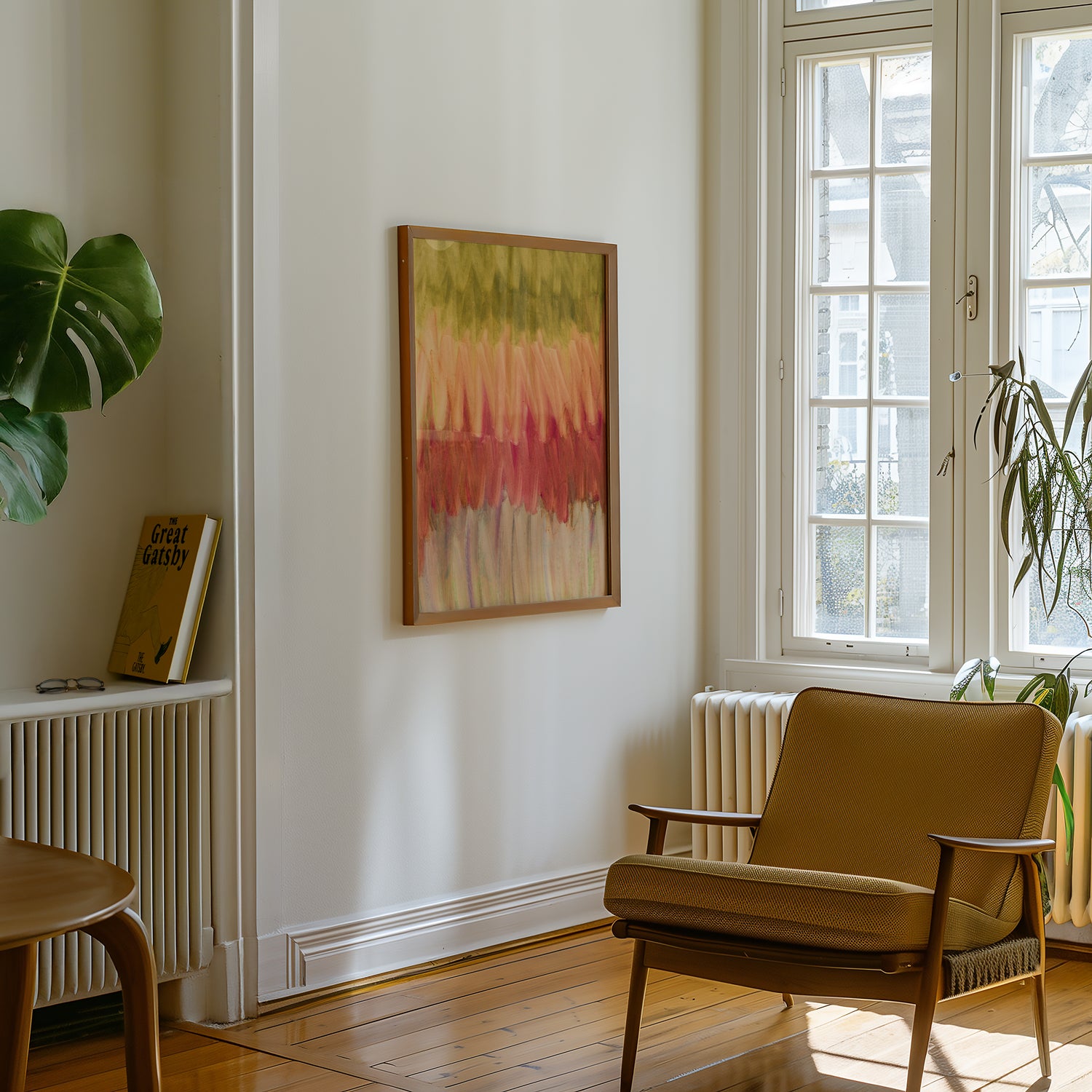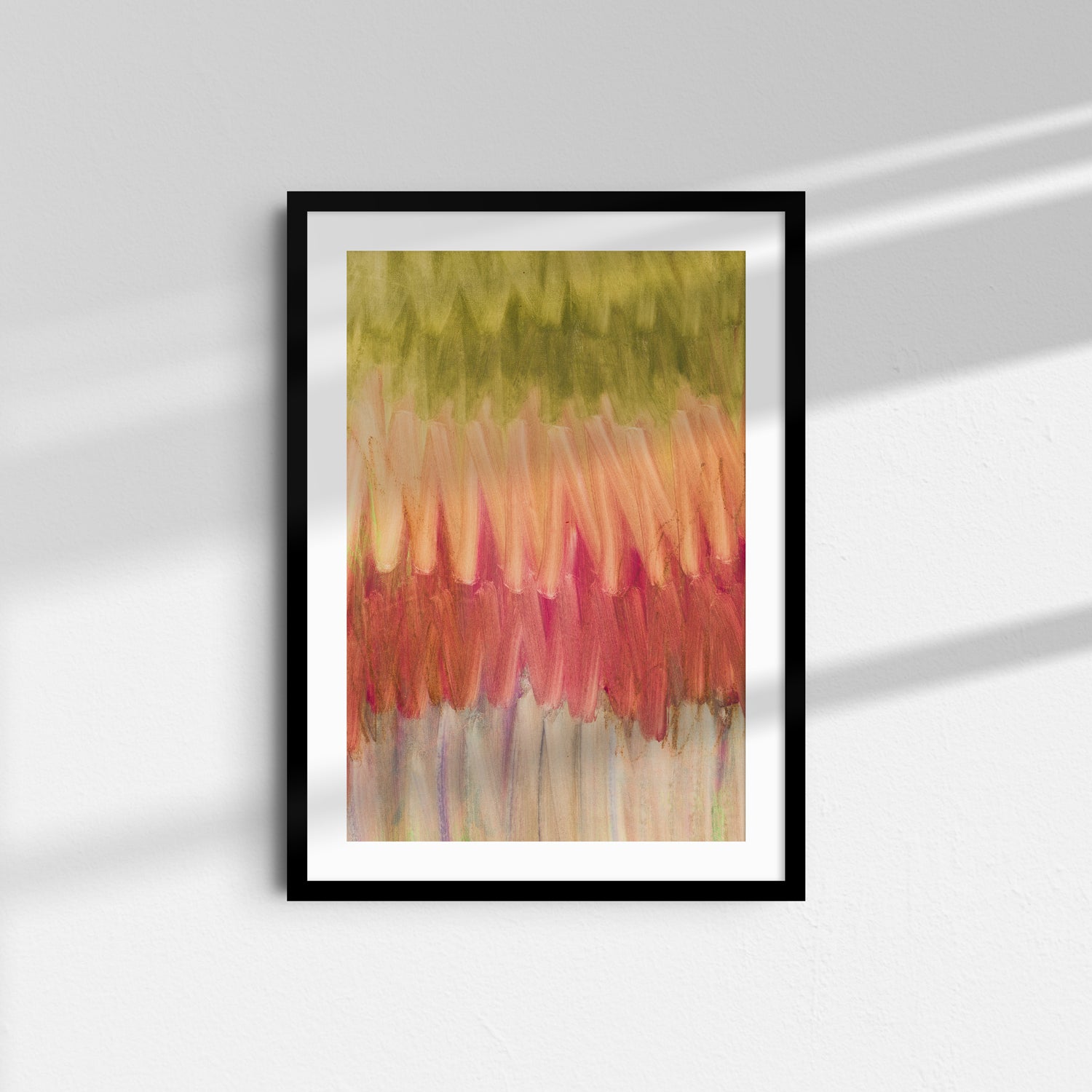Rows of greens, pinks, and earthy reds stack like a hillside filled with fruit trees. The repeated marks bring a rhythm that feels both natural and intentional. It has the softness of a warm afternoon and the structure of a landscape remembered rather than seen.