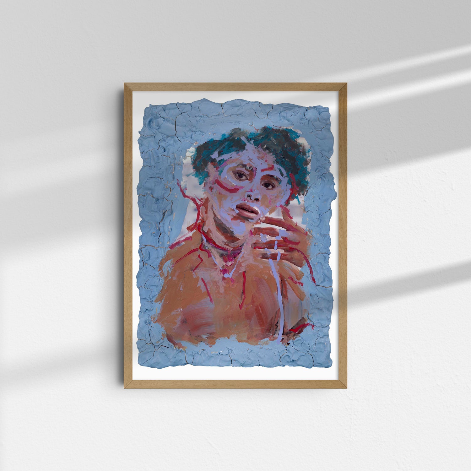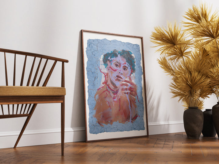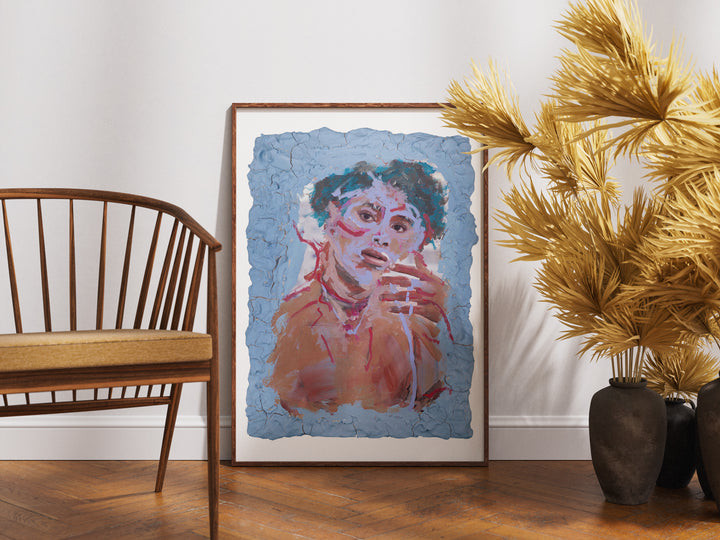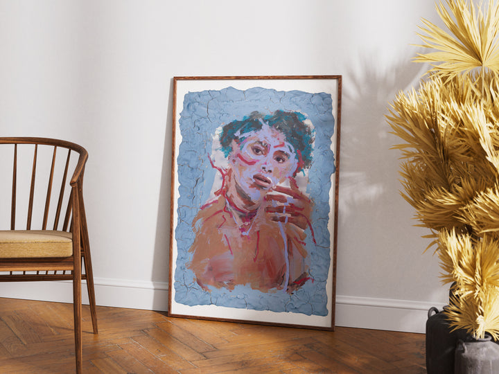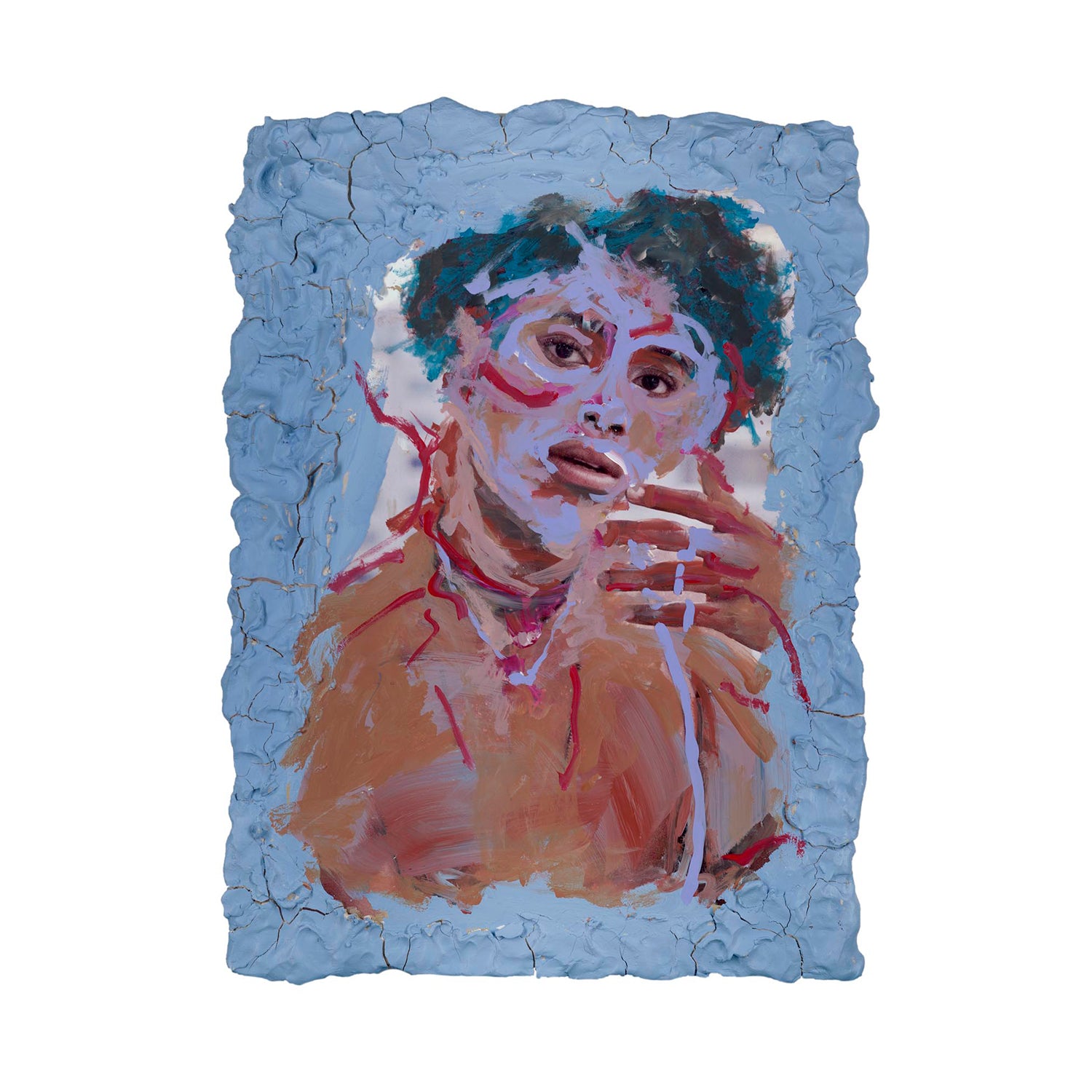 Energetic strokes of blue, red, and violet race across the figure’s skin, turning emotion into texture. The clay border seems to crumble outward, mirroring the portrait’s restless movement. A sense of transformation lingers as if caught mid-expression.