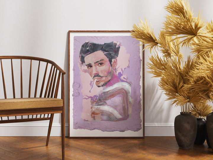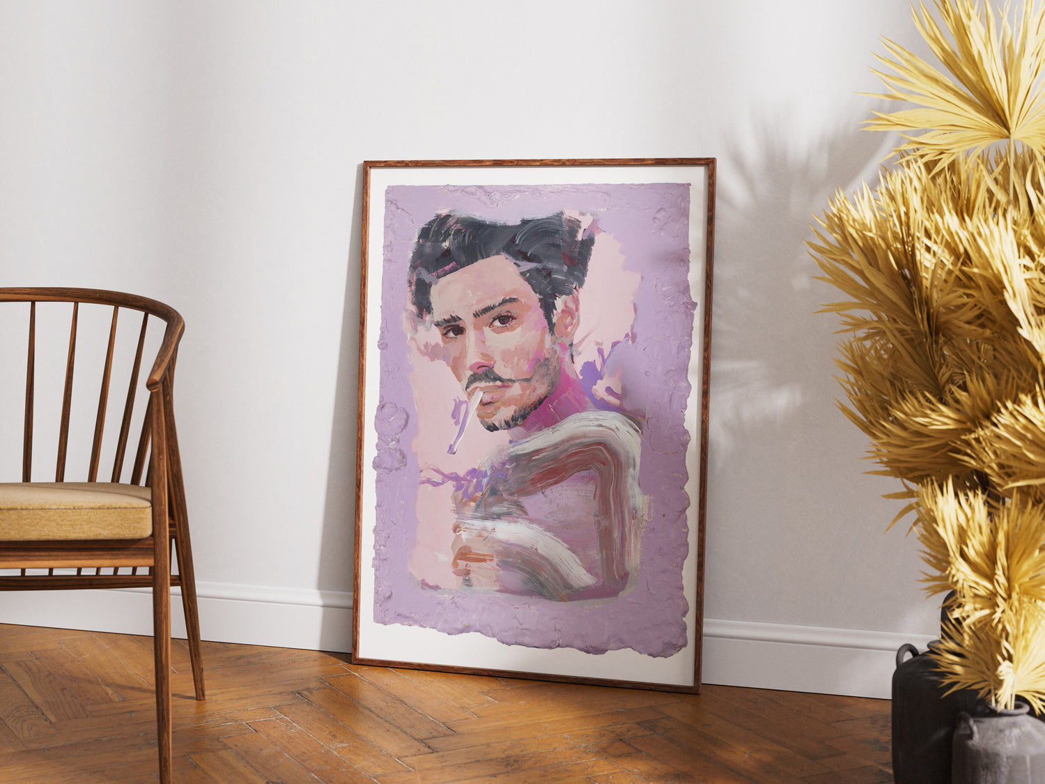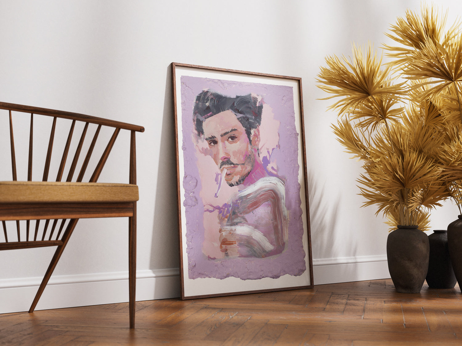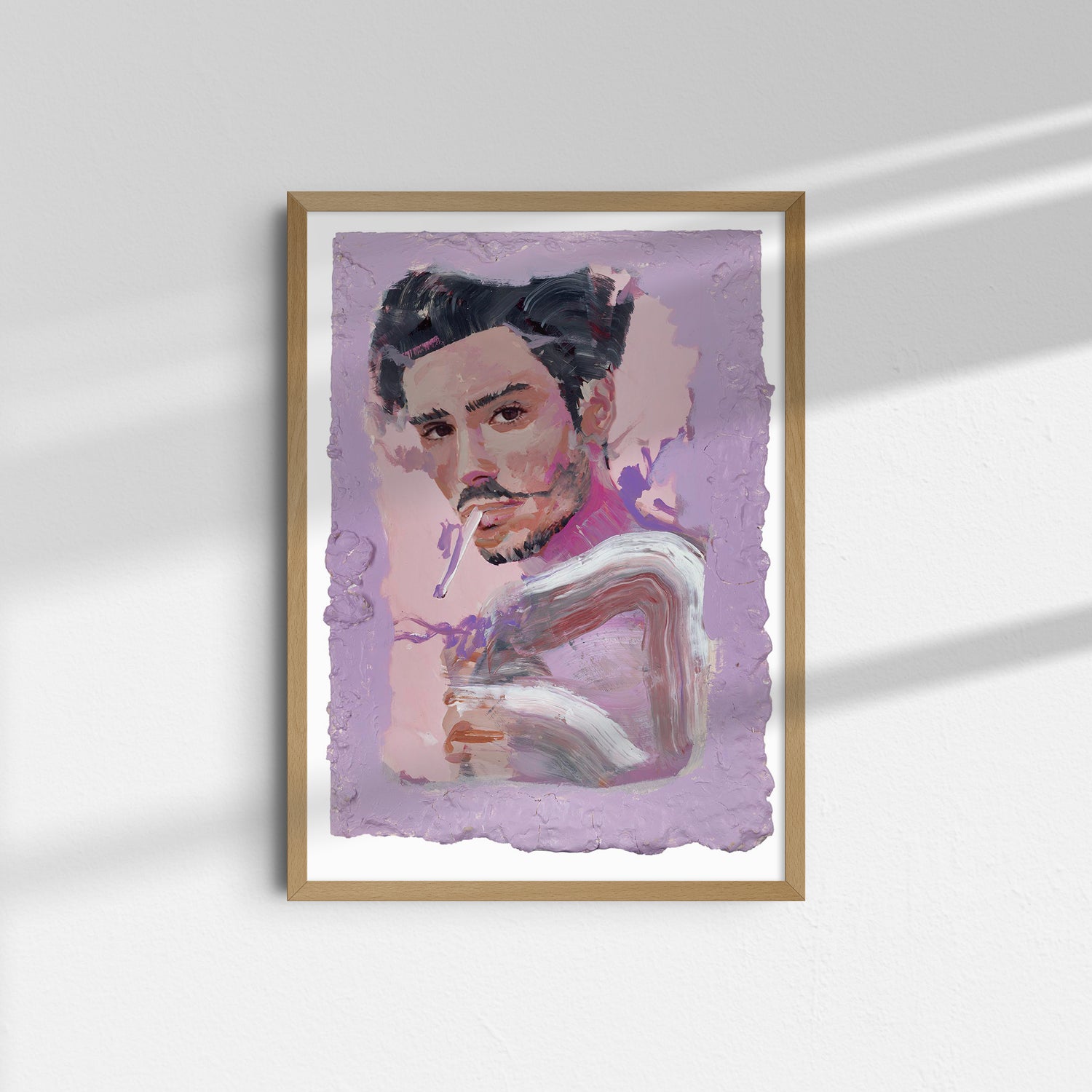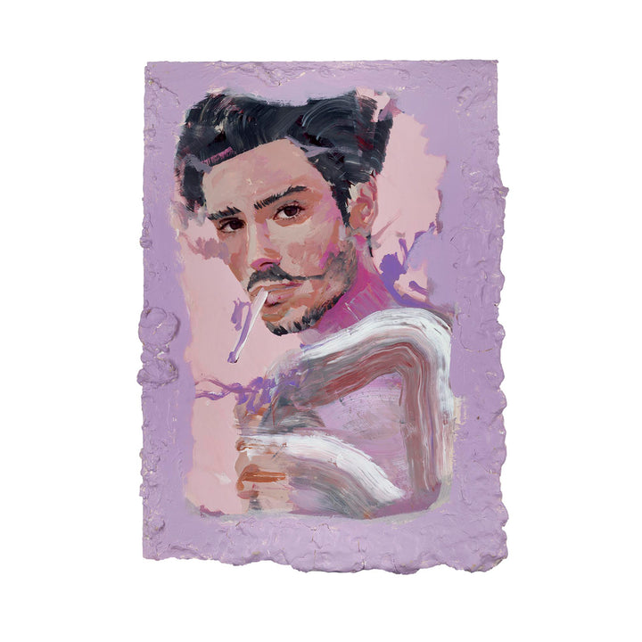 A contemplative figure is surrounded by gentle purples and muted reds, painted with sweeping, instinctive marks. His slightly cocked gaze and drifting smoke give the work a cinematic stillness. The tactile clay border adds weight to an otherwise airy moment.