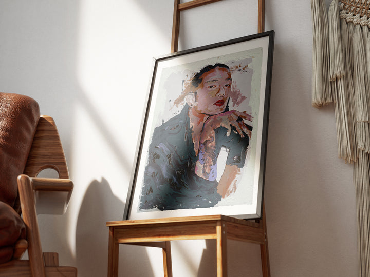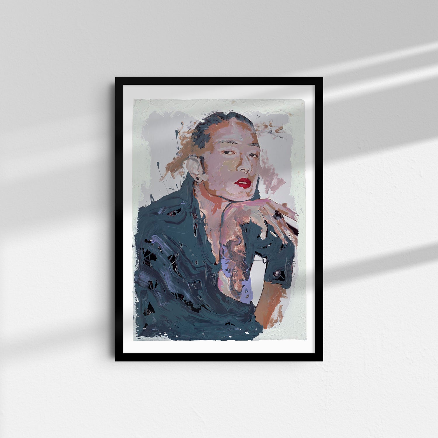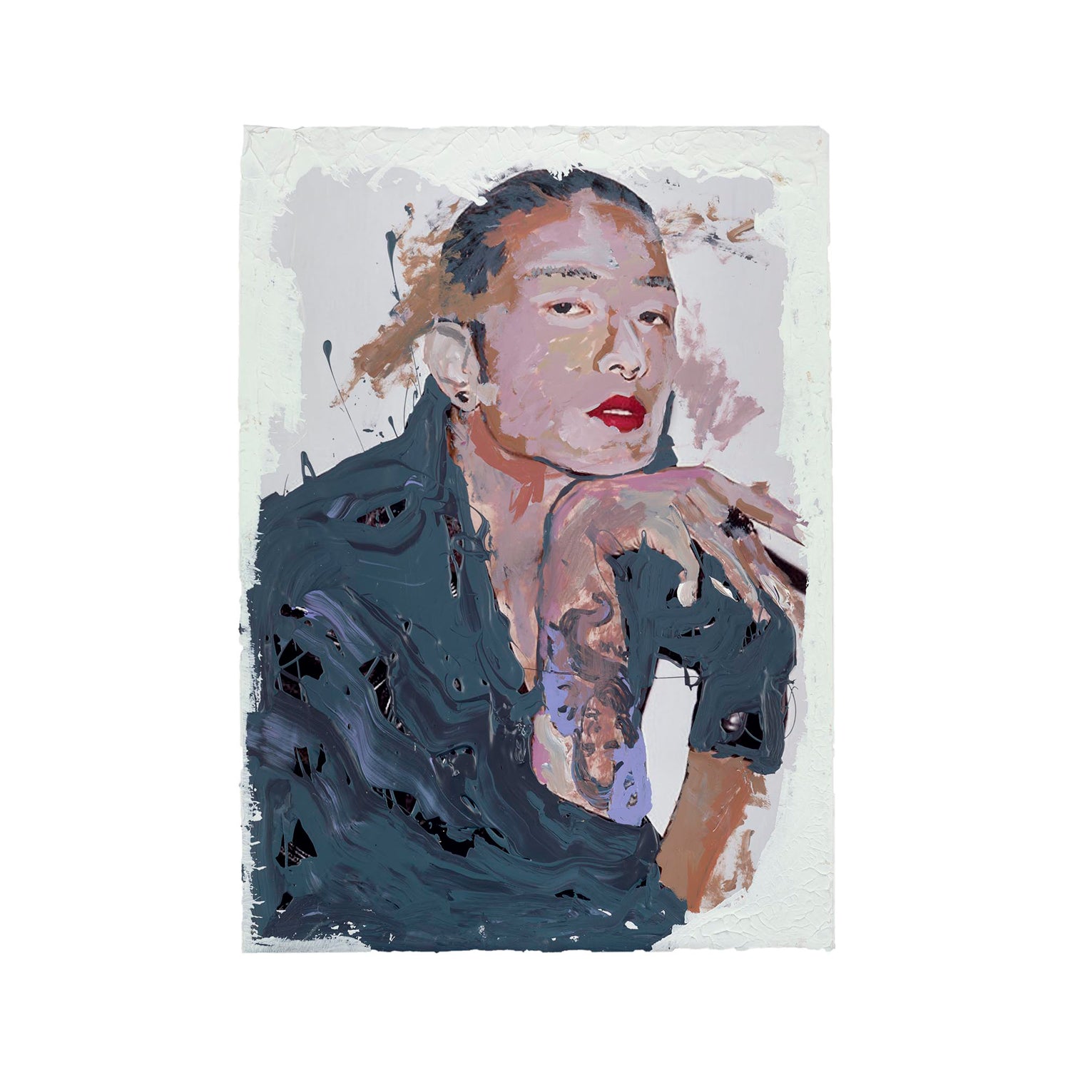 Deep slate-blue strokes melt into the figure’s clothing, creating a fluid, almost liquid surface that contrasts with their steady, lifted gaze. The white clay frame softens the drama, drawing attention to the subtle shifts of colour in the face and hand. It’s a portrait caught between stillness and movement. Self-assured, thoughtful, and quietly intense.