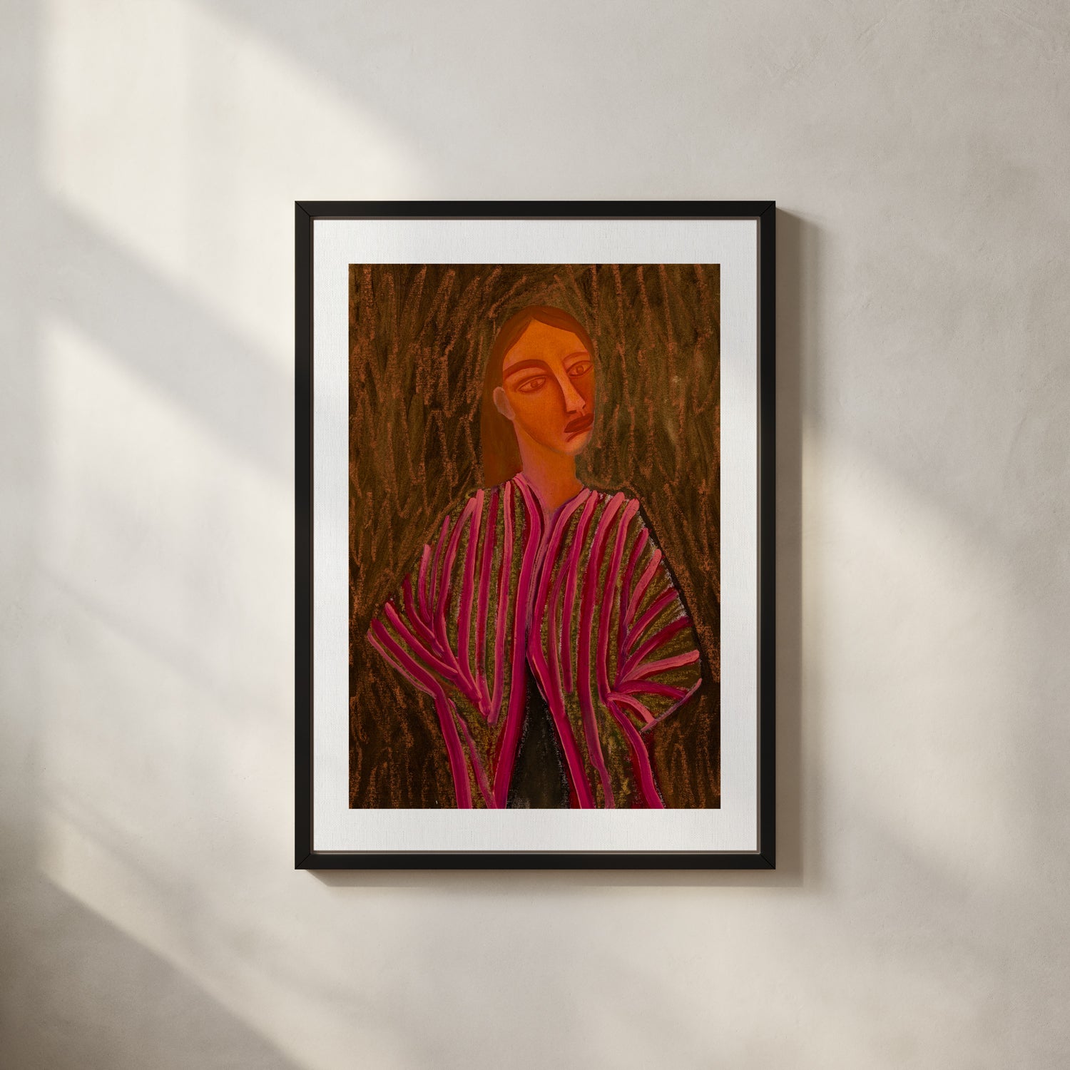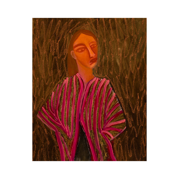 Layered pink and red stripes drape across the figure, glowing softly against a textured brown background. This artwork blends bold pattern with quiet emotion, creating a piece that feels both striking and serene.