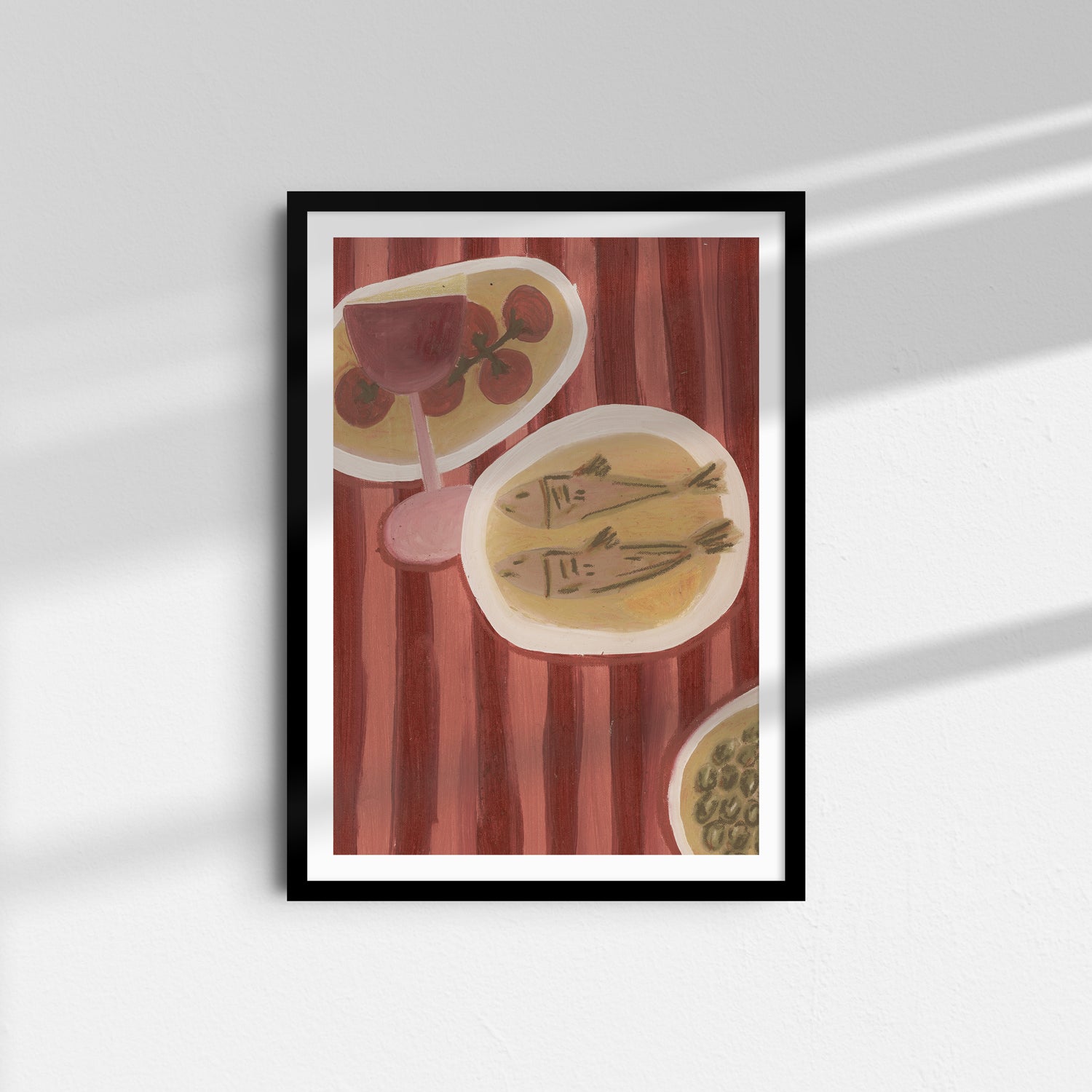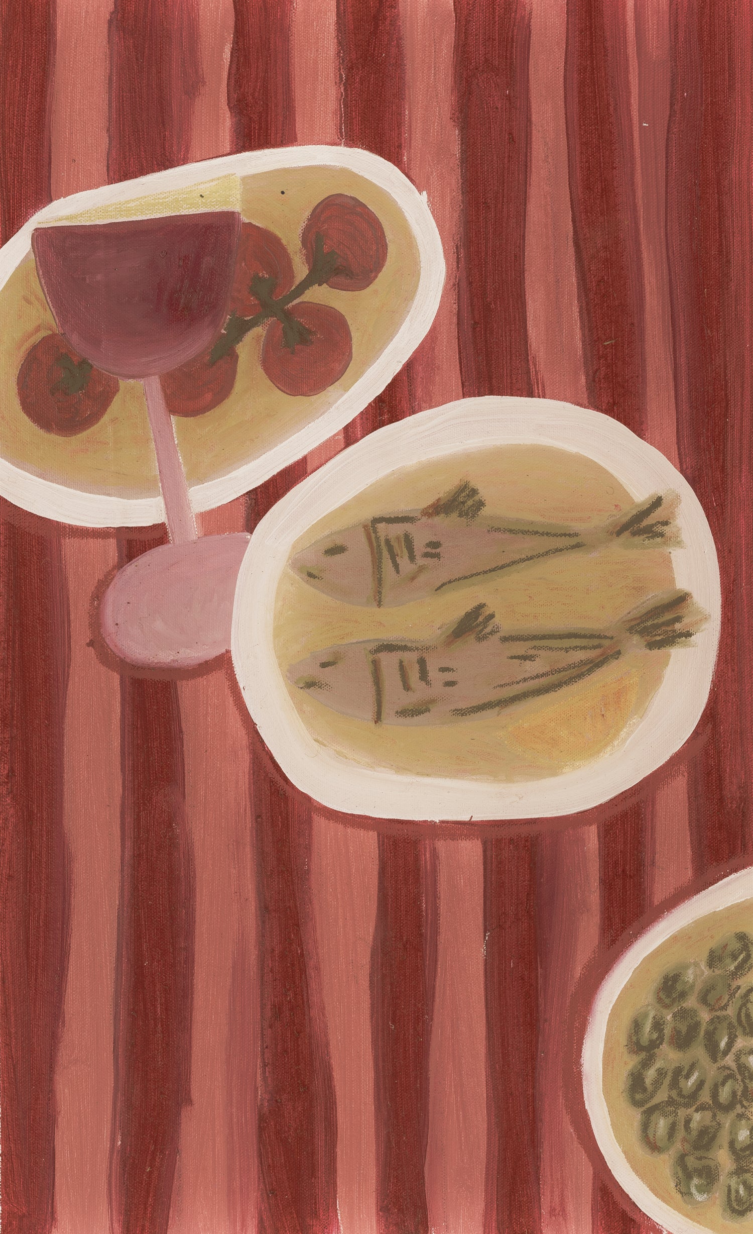 A glass of red wine, fresh tomatoes on the vine, and two small fish rest gently across a striped red tablecloth.