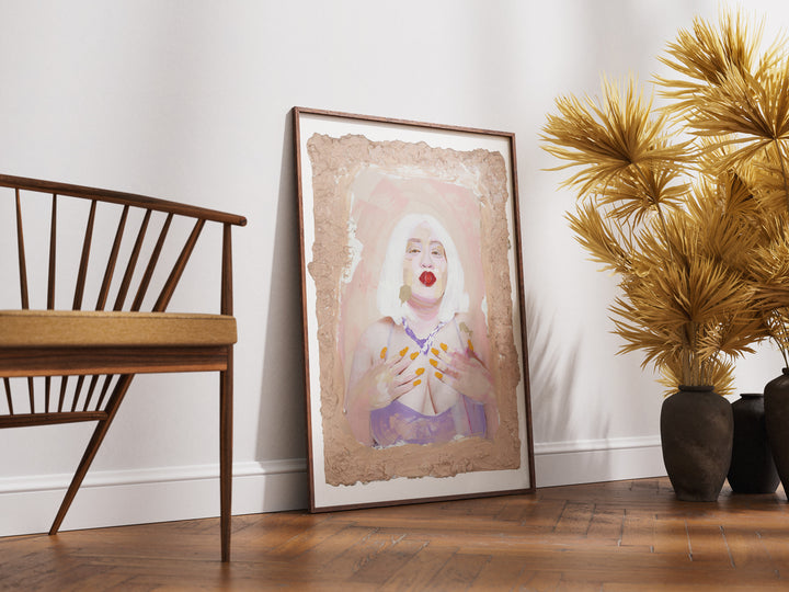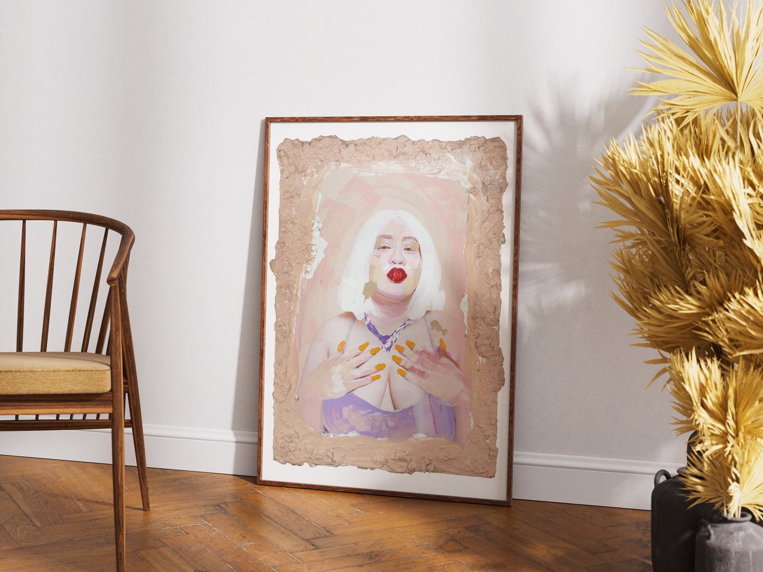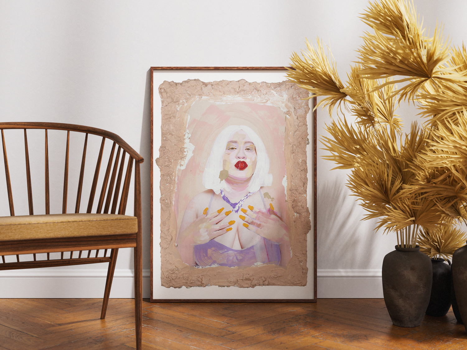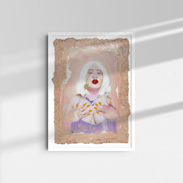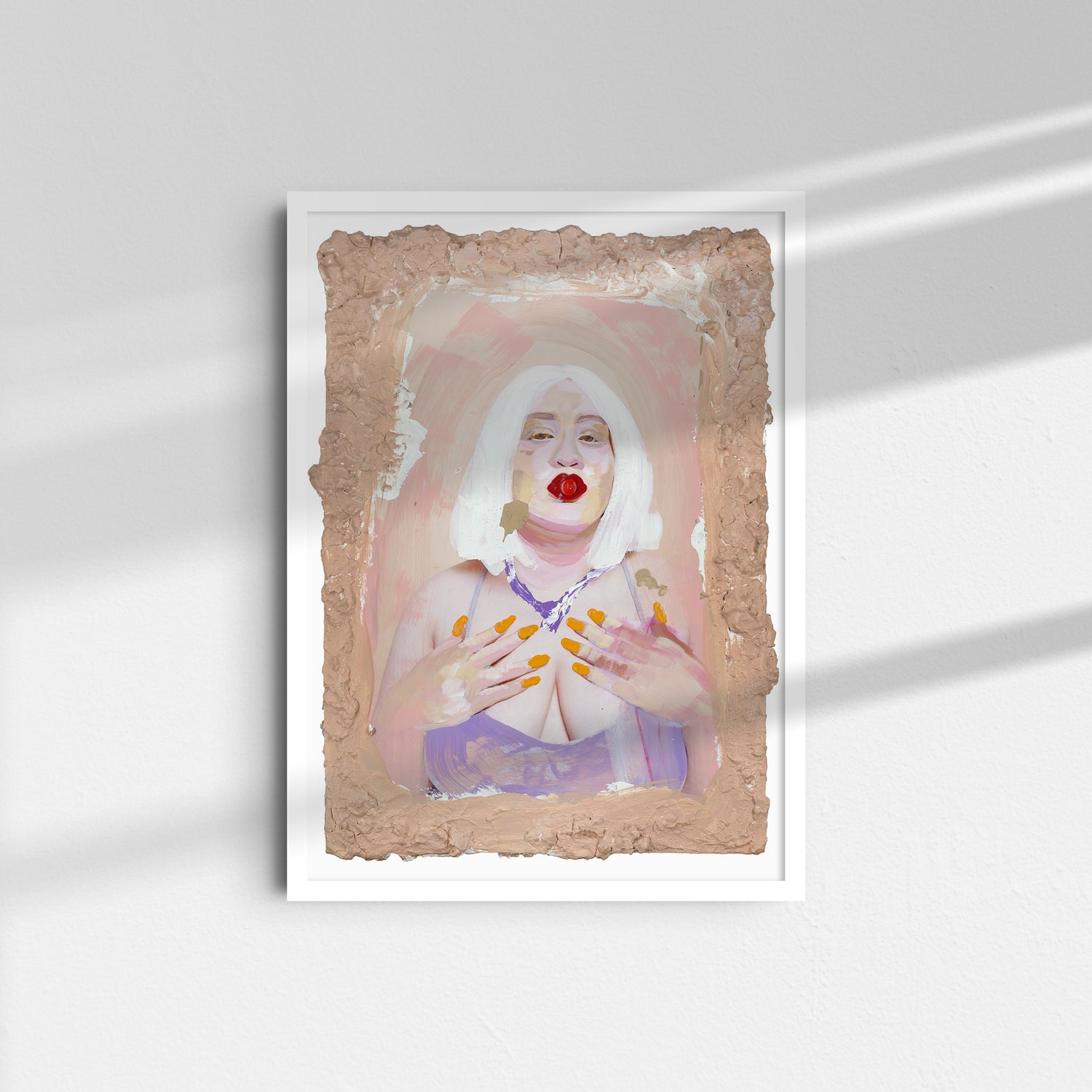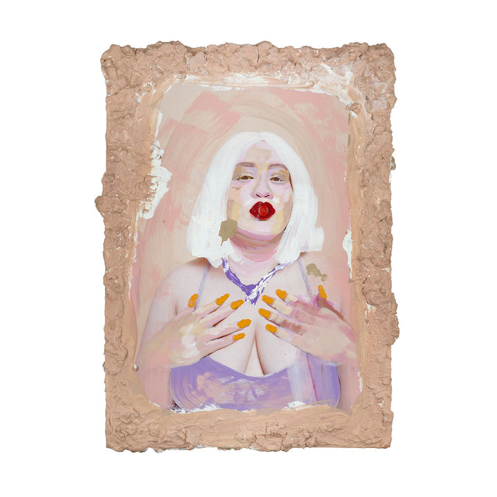 A figure emerges through soft, nude-toned brushstrokes, her painted lips bold against gentle textures. The clay frame feels sculpted in real time, echoing the work’s tactile vulnerability. Her hands and pose create a quiet defiance, equal parts intimacy and power.