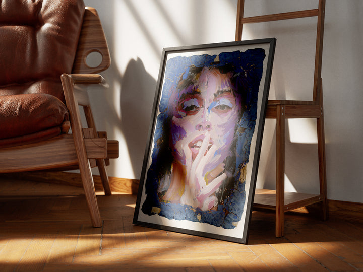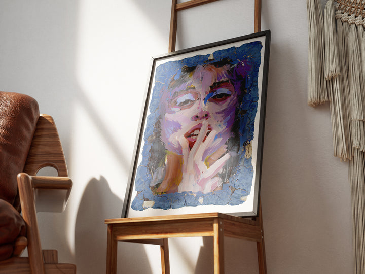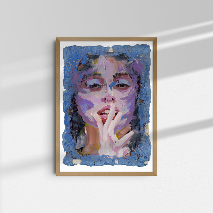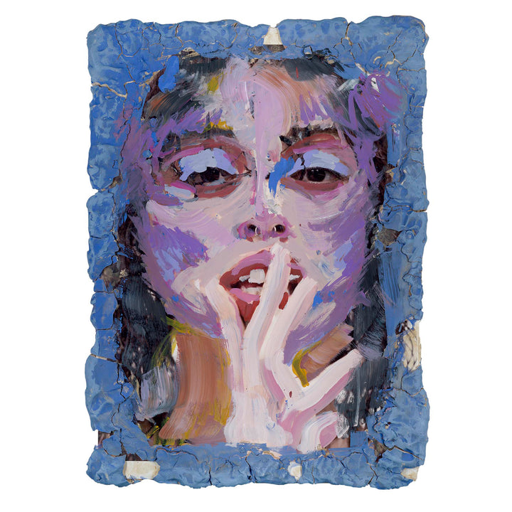 Layers of lavender and cobalt paint blur the boundary between photography and gesture. Her half-open mouth and lifted hand suggest a moment suspended, delicate yet charged. Crackled clay edges emphasise the rawness of the portrait’s emotional surface.