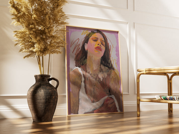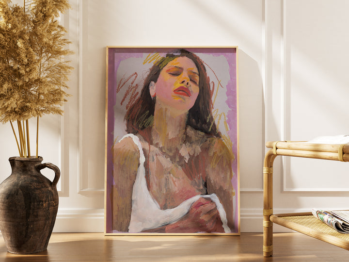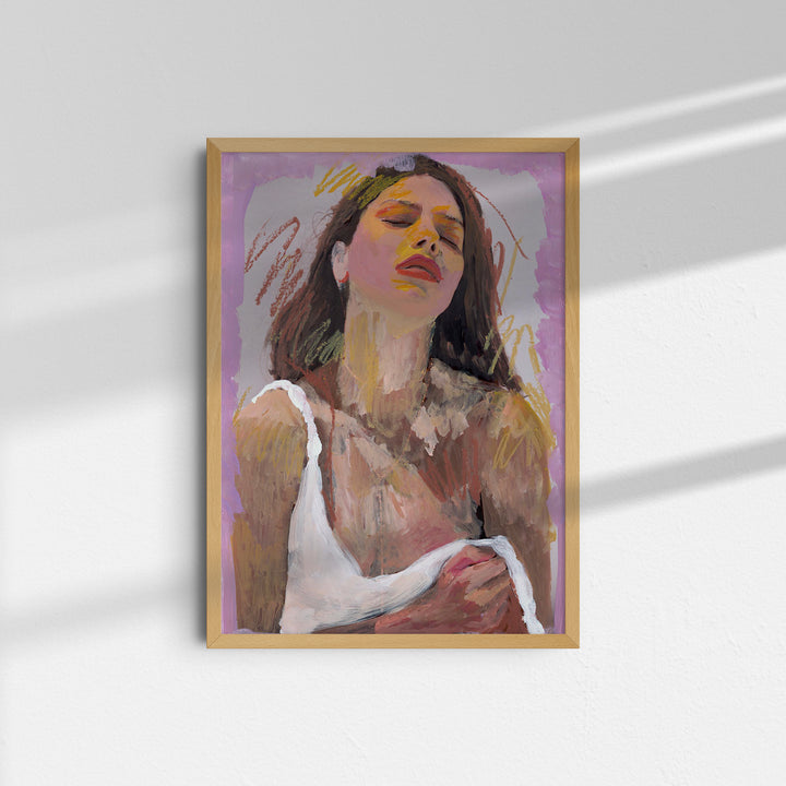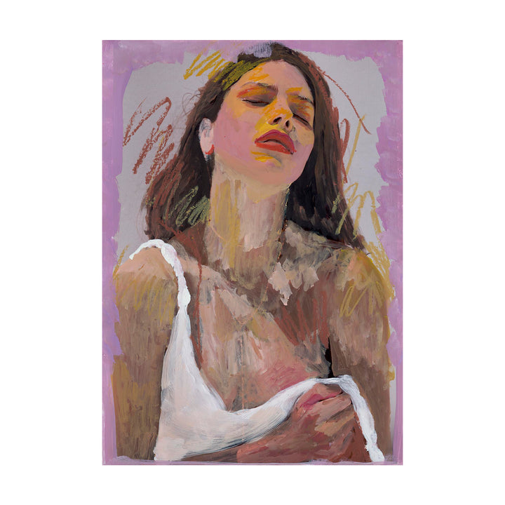 Tilted upward, the sitter appears to drink in an unseen radiance. Yellow marks illuminate the face, pushing warmth across a cool lavender frame. It’s a portrait about seeking brightness, on the skin and beneath it.
