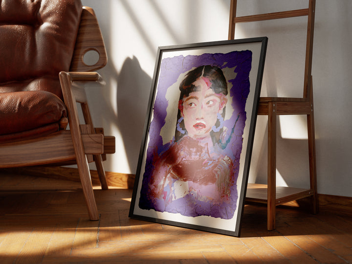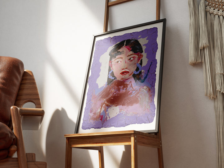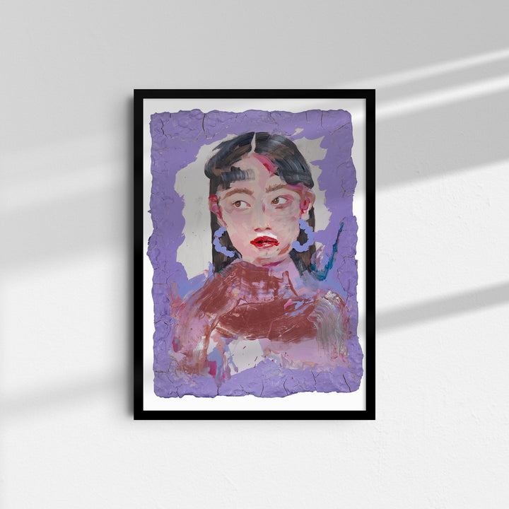 Deep violets and gentle pinks swirl around the figure, creating a layered, atmospheric field. Her upward glance feels curious, alert, almost mid-thought. The cracked clay frame heightens the sense of a portrait shaped by touch and instinct.