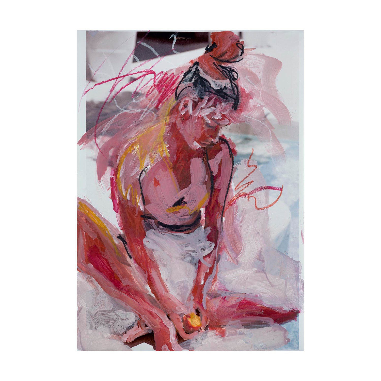 Paint cascades around the figure in arcs of red and plum, echoing the inwardness of the sitter’s posture. The overpainting exaggerates the emotional temperature, turning stillness into something quietly smouldering. It’s a portrait charged with interior heat.