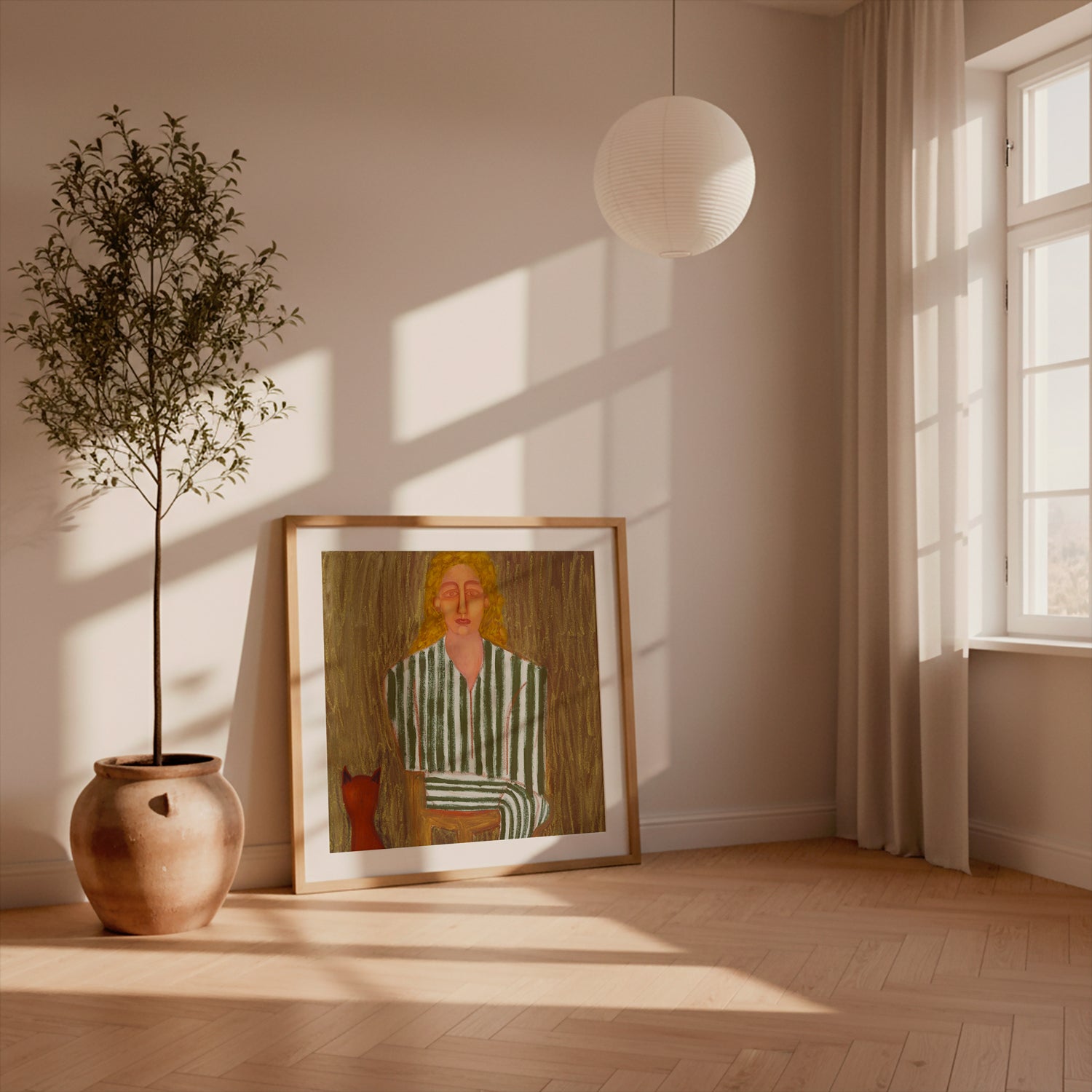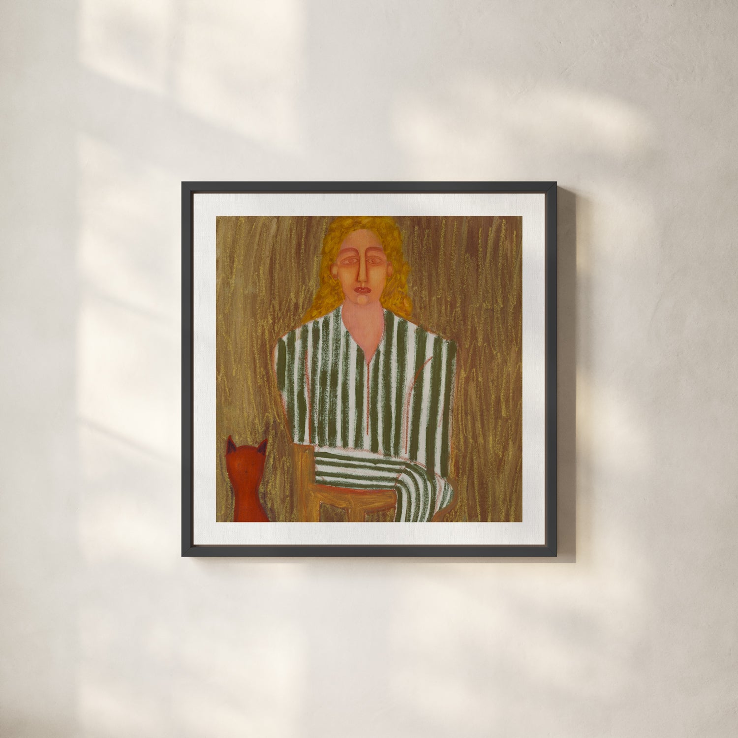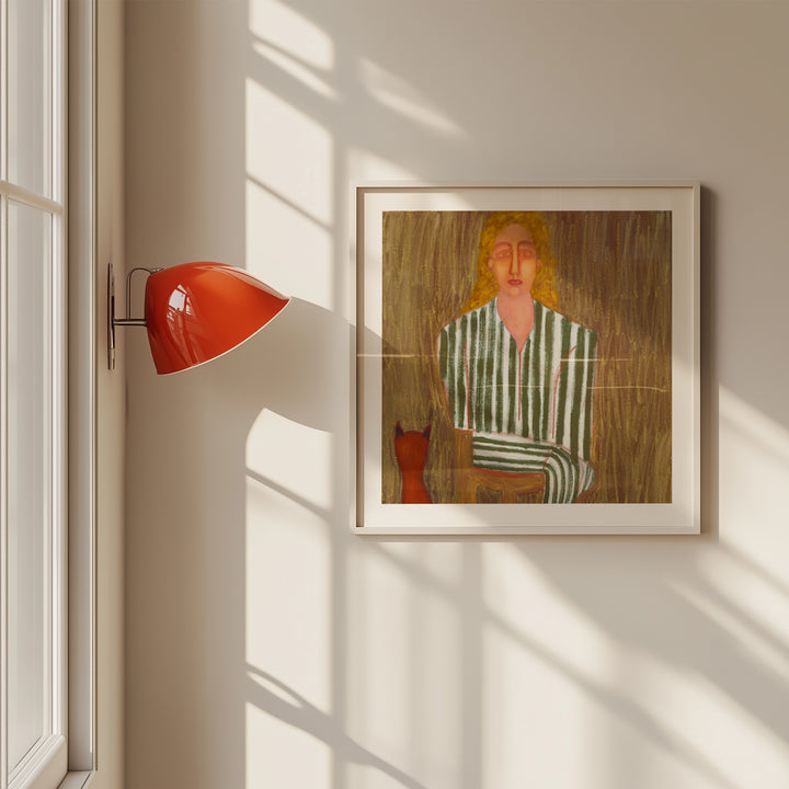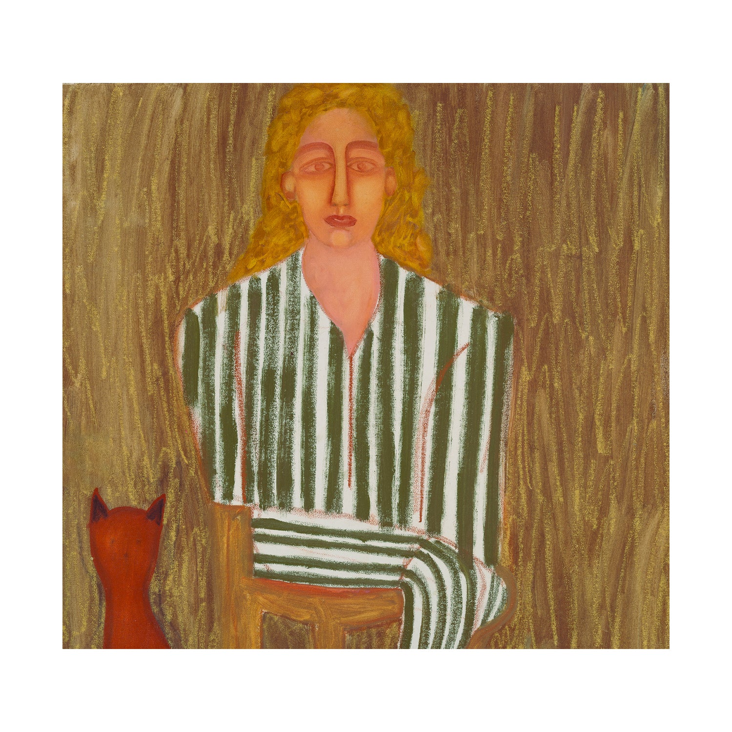 A quiet moment captured in green-and-white stripes, with a small red cat seated nearby. Textured brushwork and warm, earthy tones give this piece a gentle, contemplative feel.