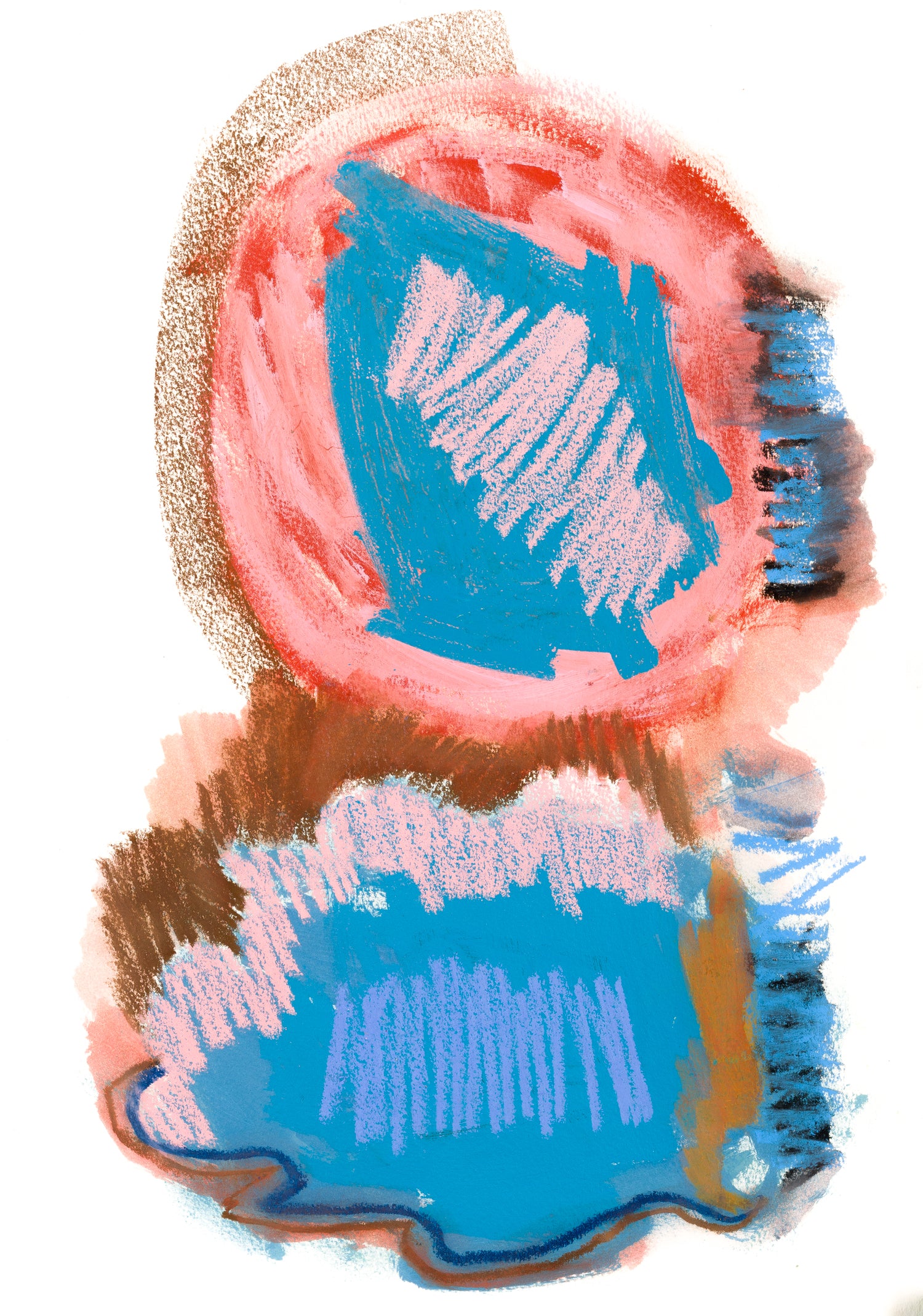 A glowing red centre radiates warmth across the canvas, surrounded by touches of blue, gold, and earthy tones. The textured marks suggest fields, petals, or waves depending on how you look. It’s bold, immersive, and rich with movement.