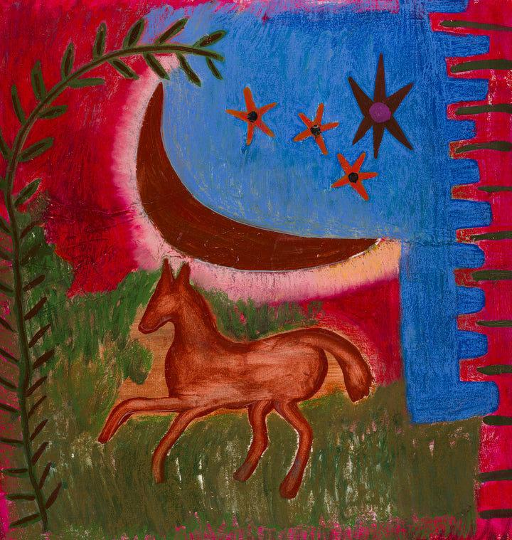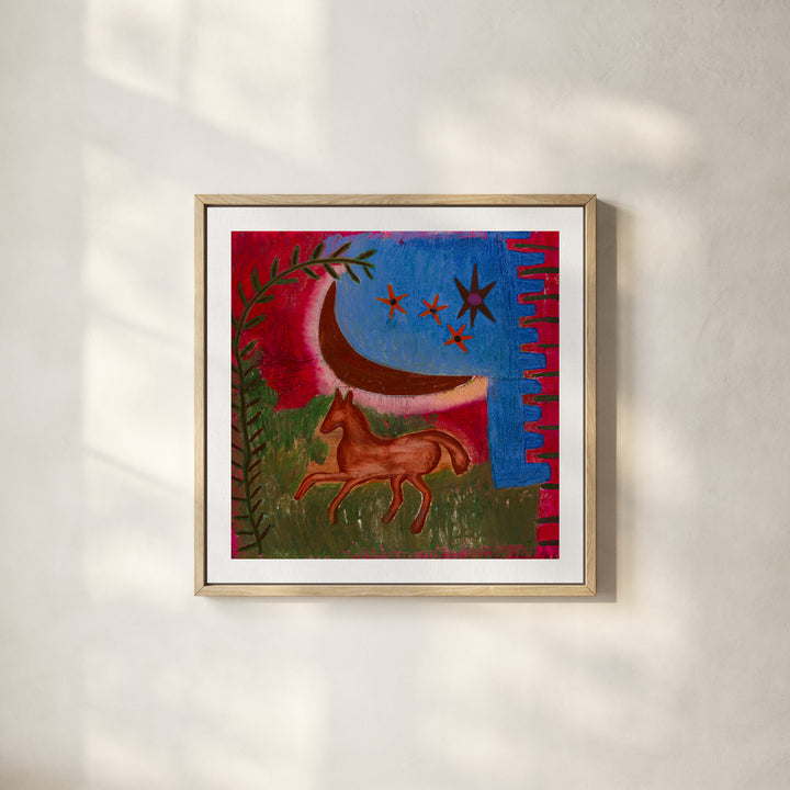Under a glowing crescent moon, a painted horse rests in a dreamlike landscape of deep reds, blues, and greens. Stars scatter across the sky while wild foliage frames this mystical scene - a moment of quiet magic and wonder.