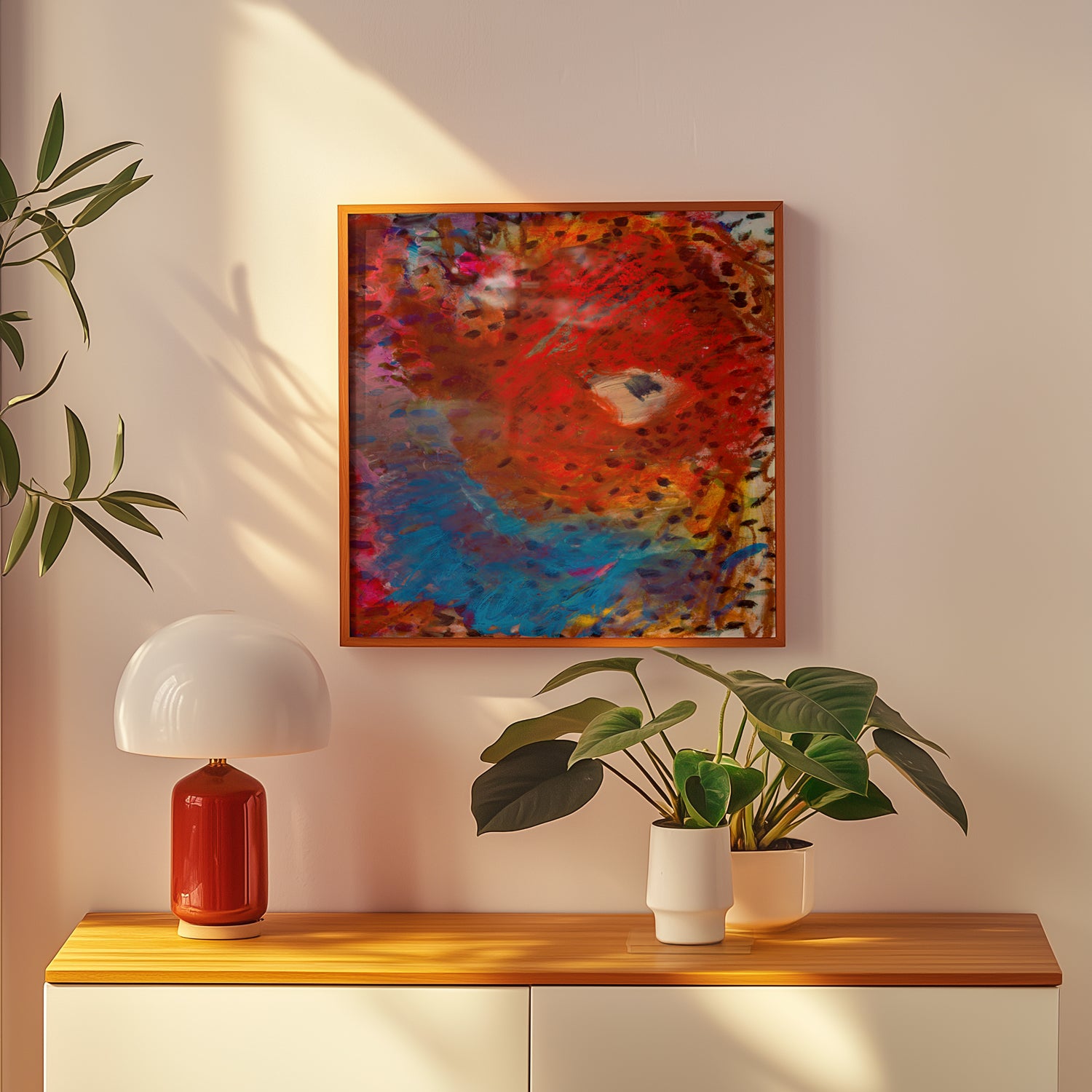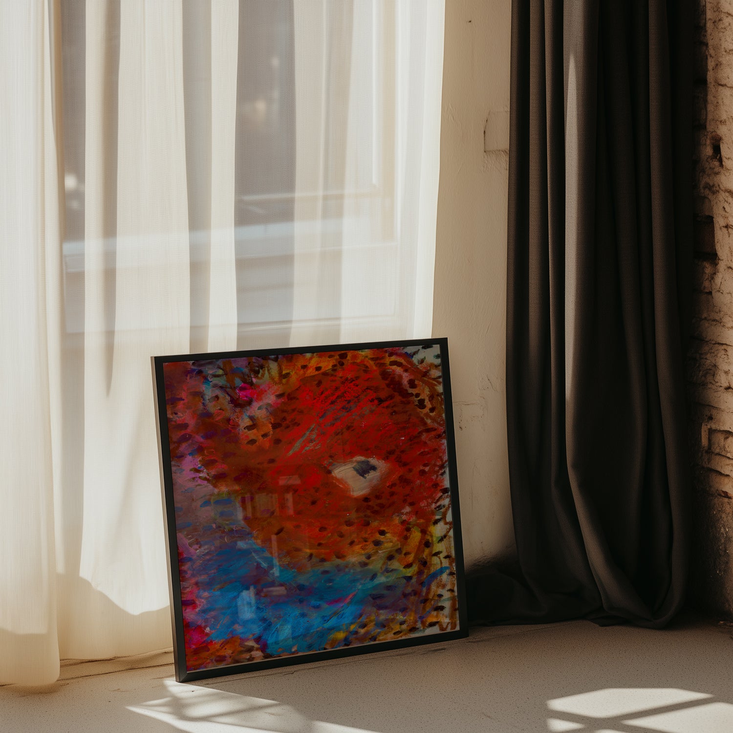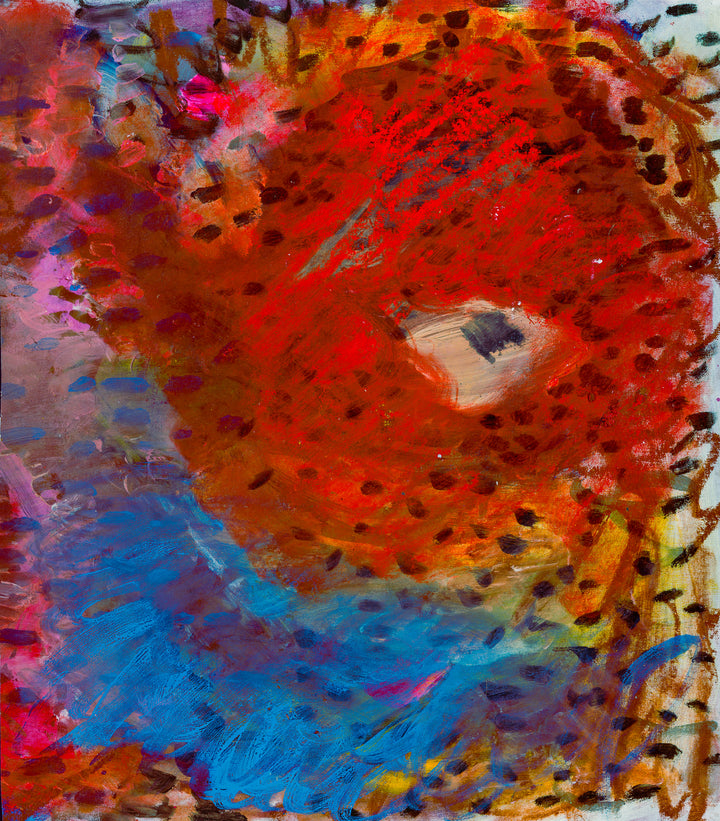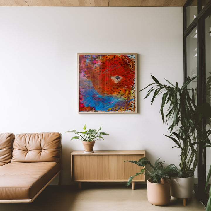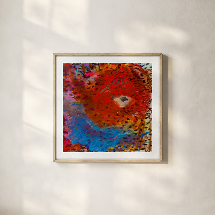Fiery reds sweep into cool blues, creating a dynamic contrast between heat and calm. Thick textures and shifting marks give the sensation of tides colliding with something burning and bright. It’s expressive, bold, and full of movement.