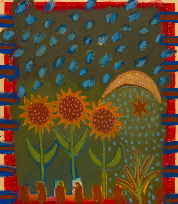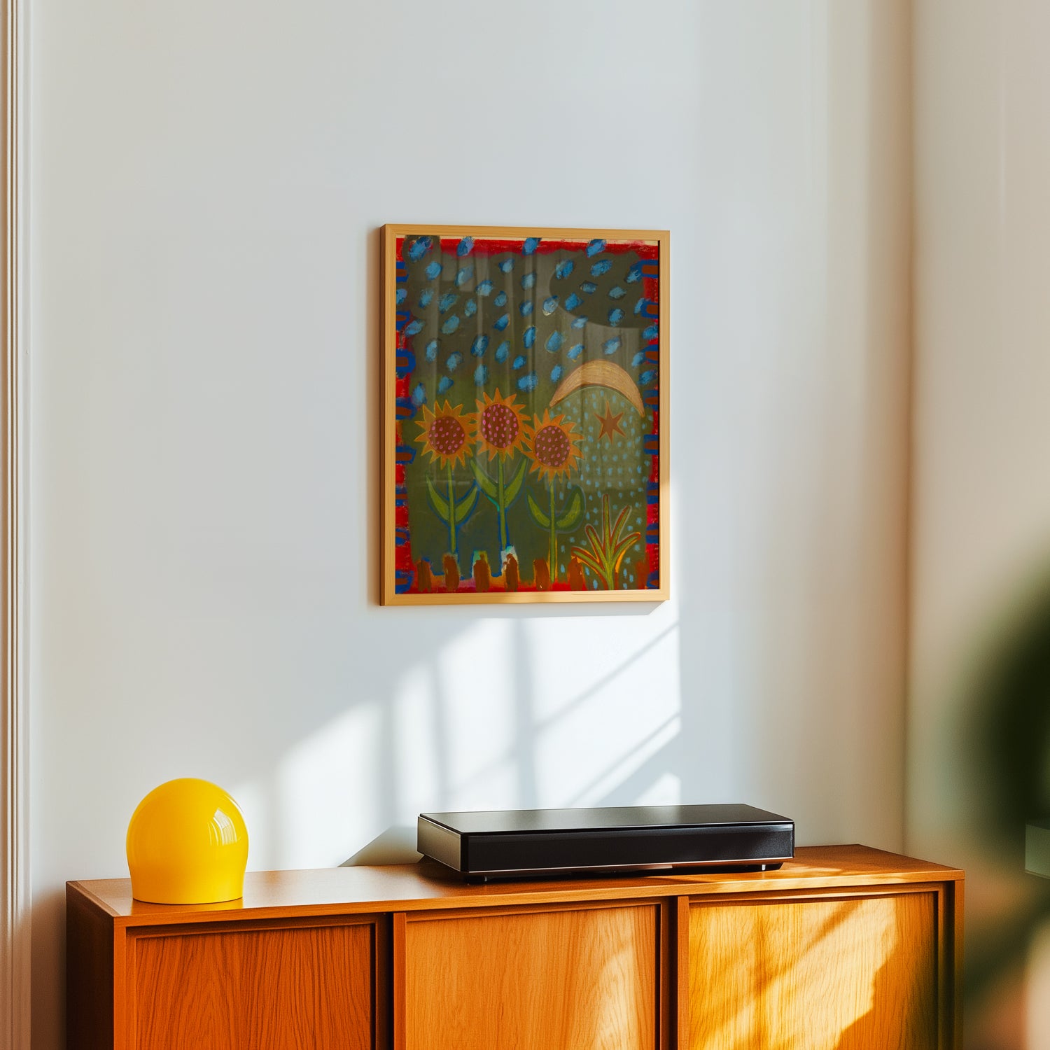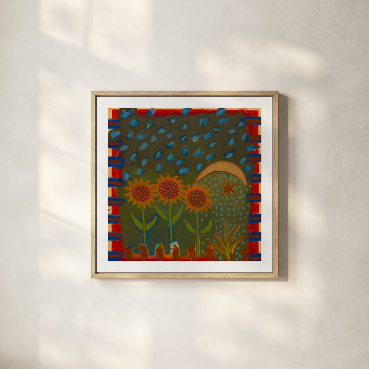 Blue stars fall softly over a crescent moon and a row of sunflowers glowing in the dusk. Warm colours and gentle shapes turn this night garden into a peaceful, dreamlike world.