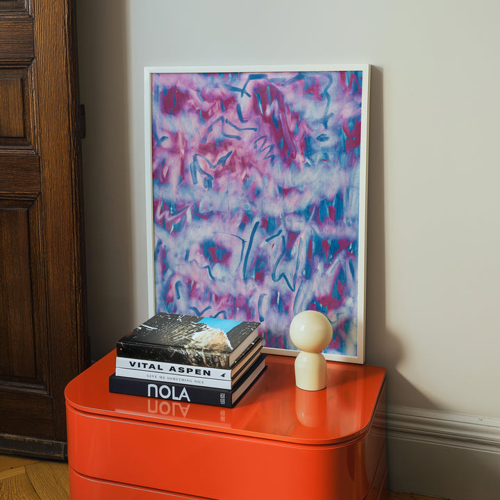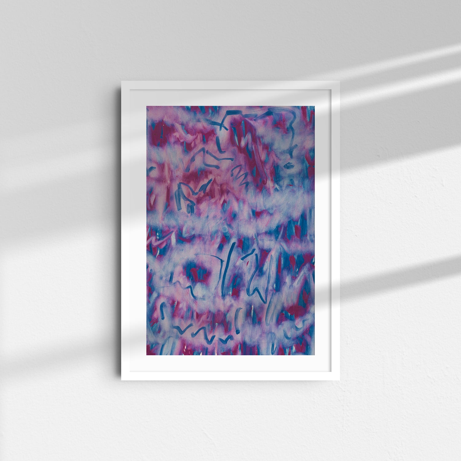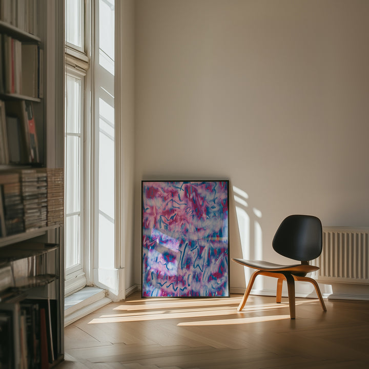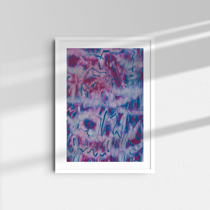 Soft violets and blues drift like mist, broken by fluid, calligraphic marks that feel almost like writing. The piece captures movement without a clear subject, giving it a dreamlike quality. It invites the viewer to interpret, guess, and wander through the gestures.