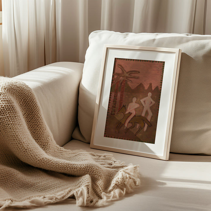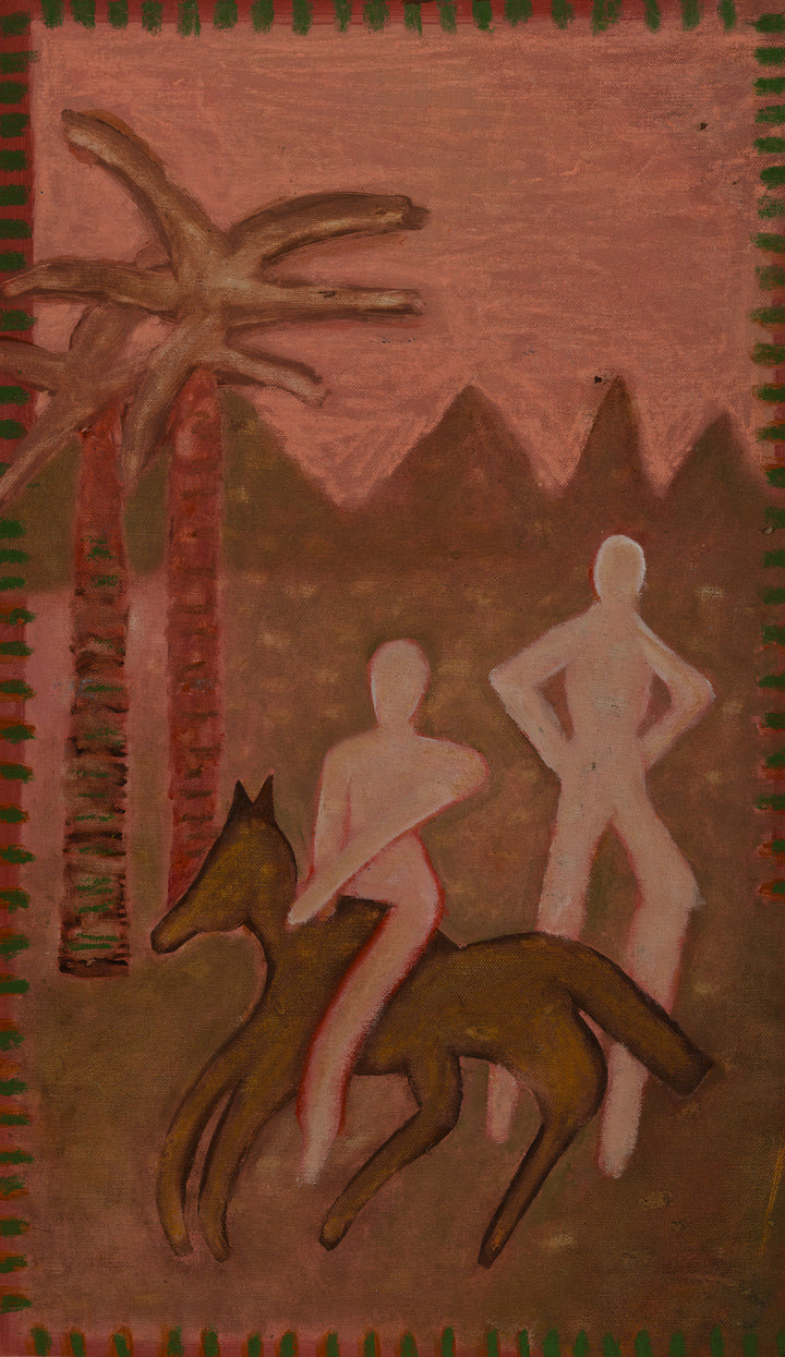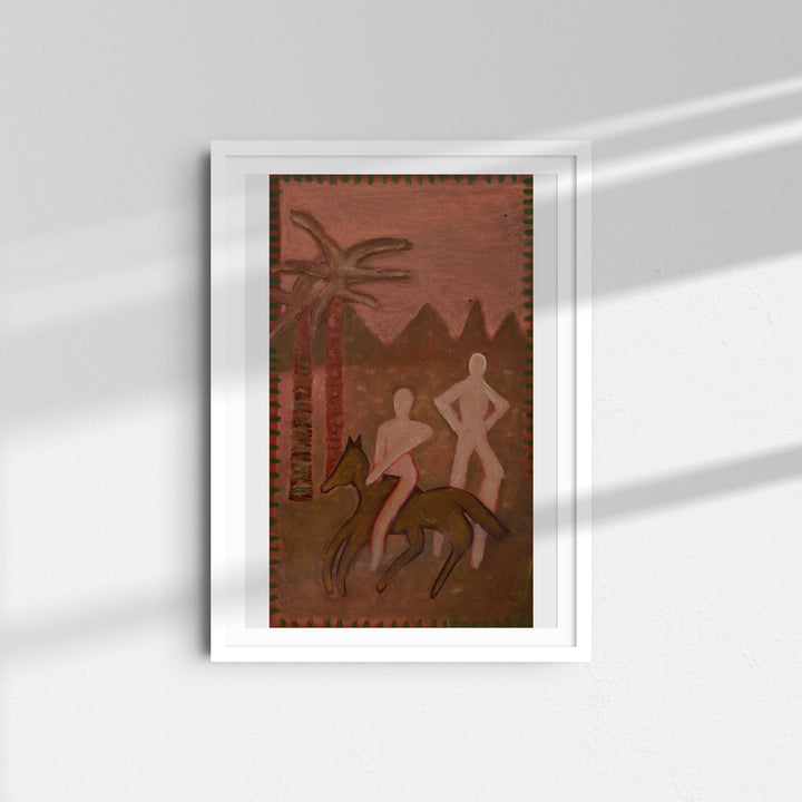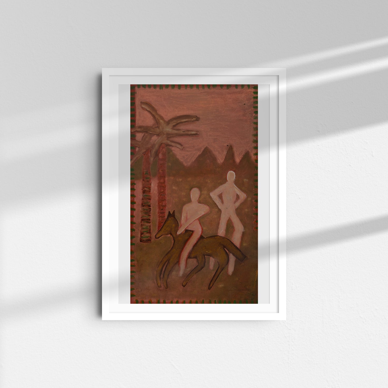 Two figures travel through a warm, rose-coloured desert at dusk - one on horseback, one standing beside tall palms and distant mountains. Soft shapes and gentle colours turn this scene into a quiet, dreamlike journey beneath the fading evening sky.