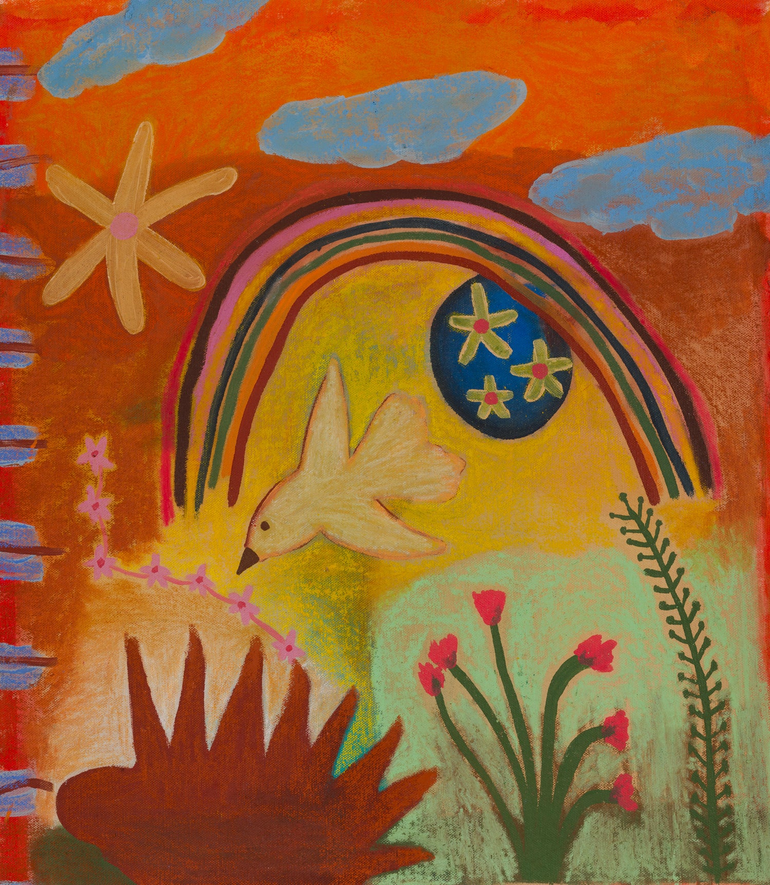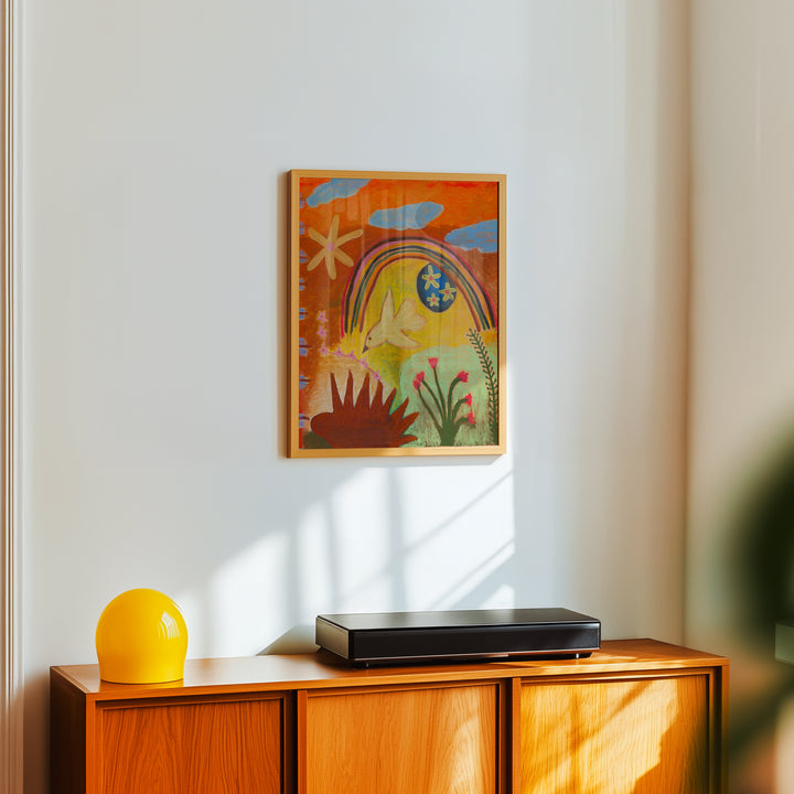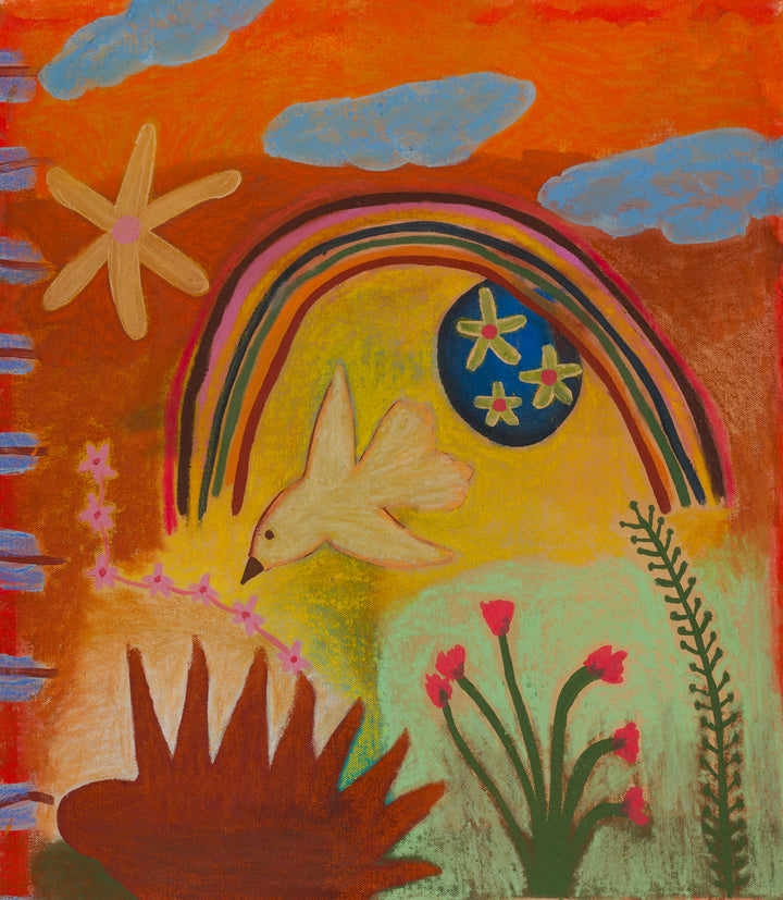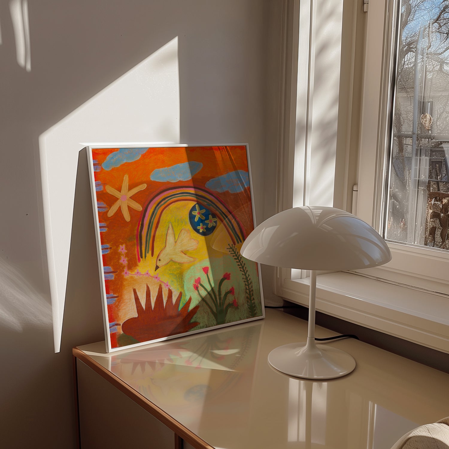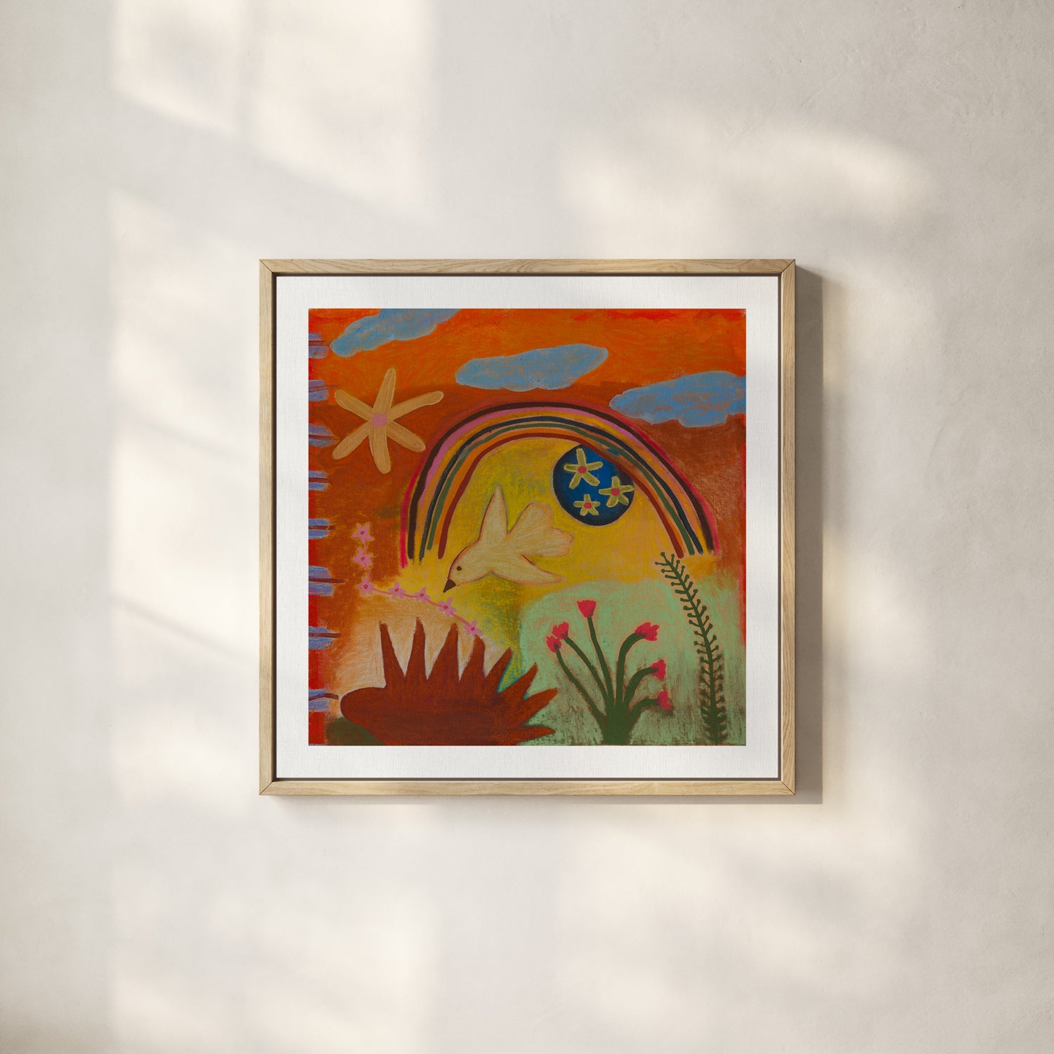 A soft golden bird floats through a bright rainbow arch, passing flowers, stars, and drifting clouds. Painted in warm oranges, pinks, and greens, this dreamy garden sky feels alive with gentle joy.