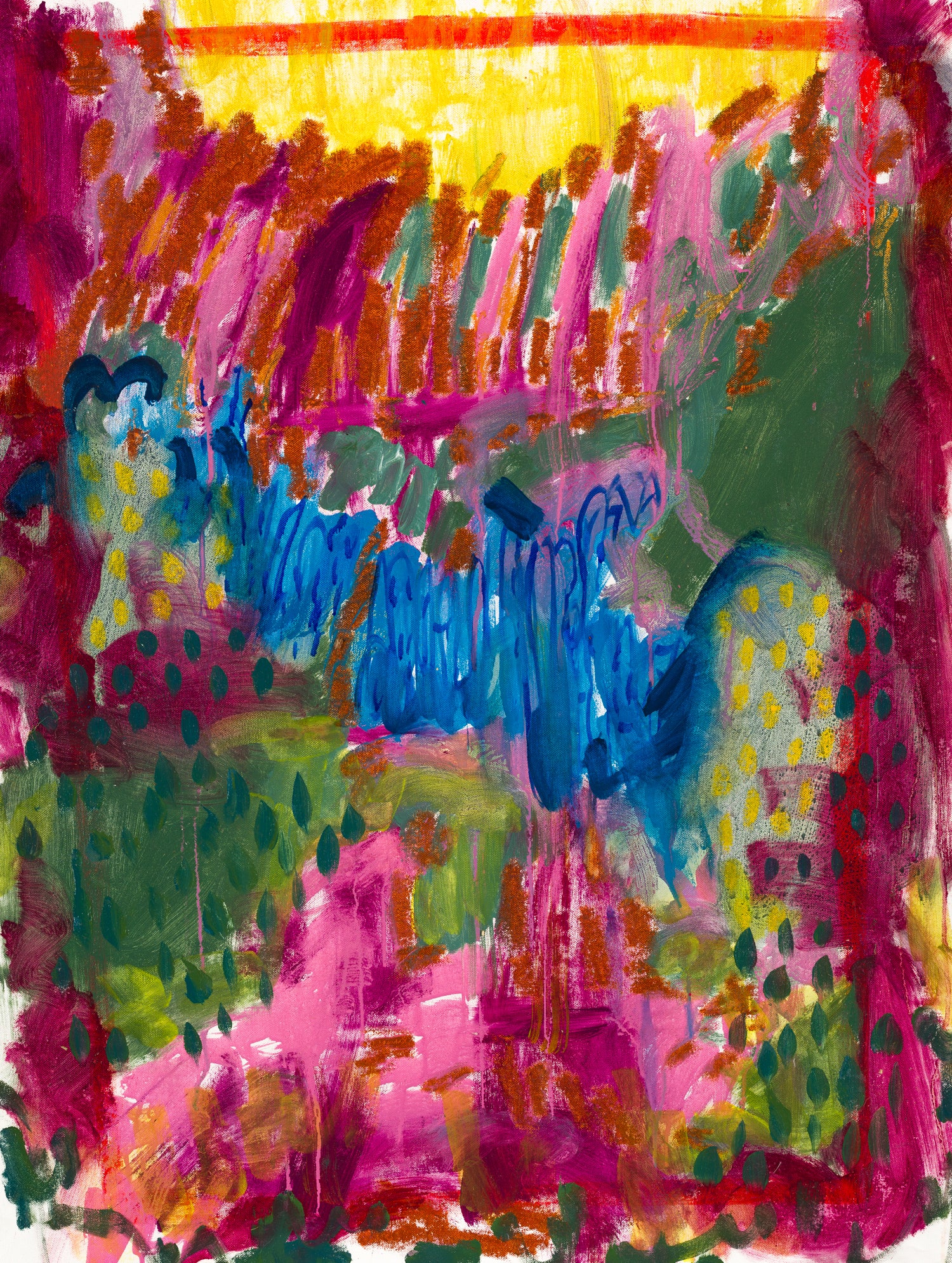 Bold pinks and deep blues brush across the canvas like a valley waking under first light. Vertical strokes rise and fall in rhythmic waves, suggesting hills, shadows, and movement. The piece feels airy and energetic, full of morning warmth.